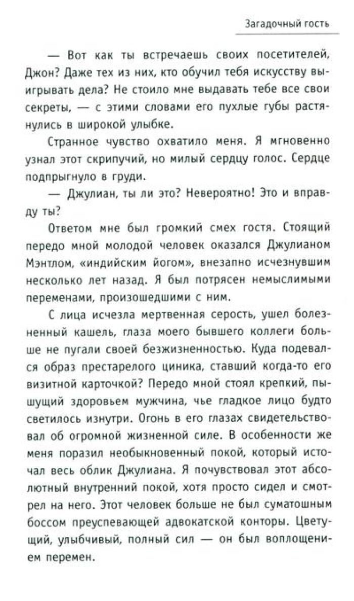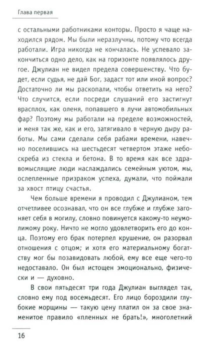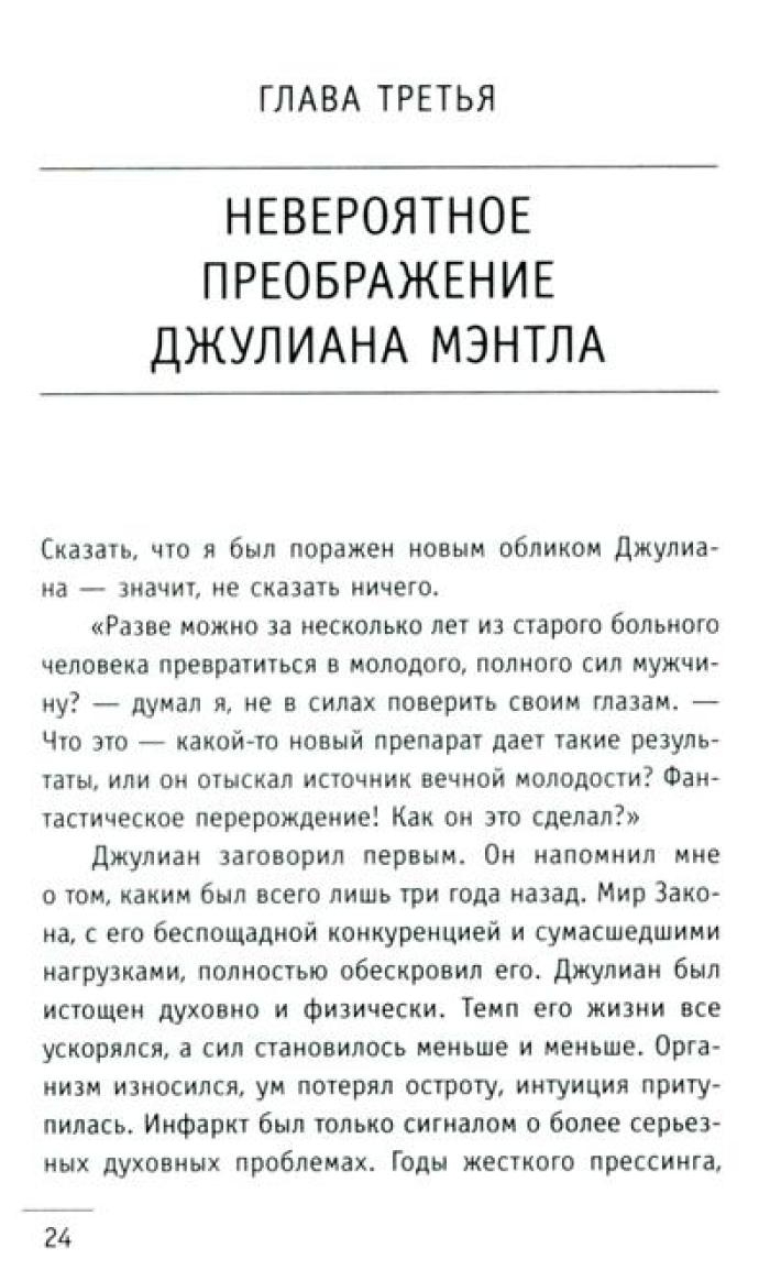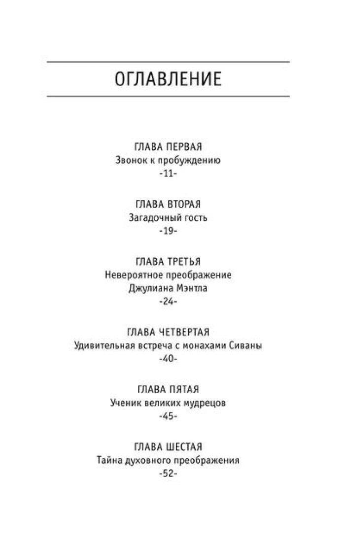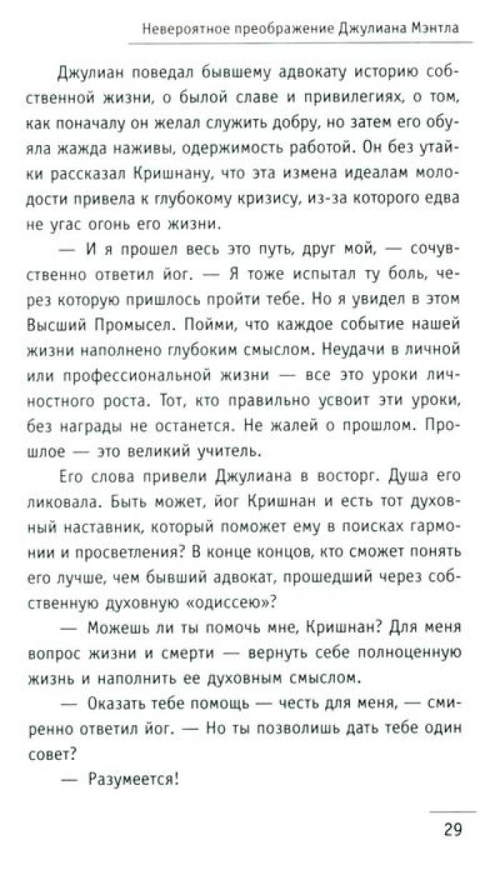 Притча "Монах, который продал свой „феррари“" проникает в сердце и мысли читателя, словно послание с небес, особенно важна она в трудные времена. В суете повседневных забот, среди множества жизненных мелочей человеку необходимо разглядеть действительно важные аспекты и ответить на сложные вопросы. Что такое подлинный успех и как его достичь? Можно ли обрести счастье, которое не зависит ни от карьерного роста, ни от мировых кризисов? Как избавиться от бесконечной заботы о завтрашнем дне и начать получать удовольствие от каждого прожитого дня? Существуют ли простые рецепты, позволяющие обрести духовные дары, не отказываясь от привычного комфорта? Как развить сверхспособности и подчинить себе судьбу? И, пожалуй, самое главное: как найти свое призвание и стать самим собой? Ответы – в этой книге! Вместе с бывшим миллионером Джулианом Мэнтлом вы совершите удивительное путешествие в Сивану – страну, где исполняются мечты!