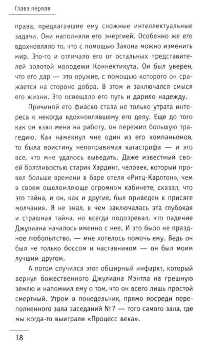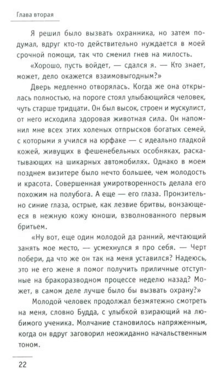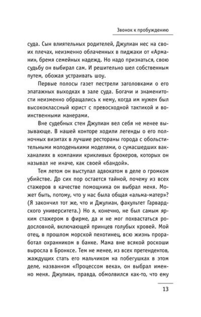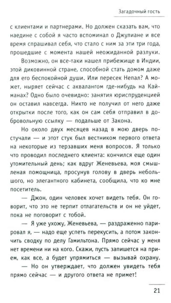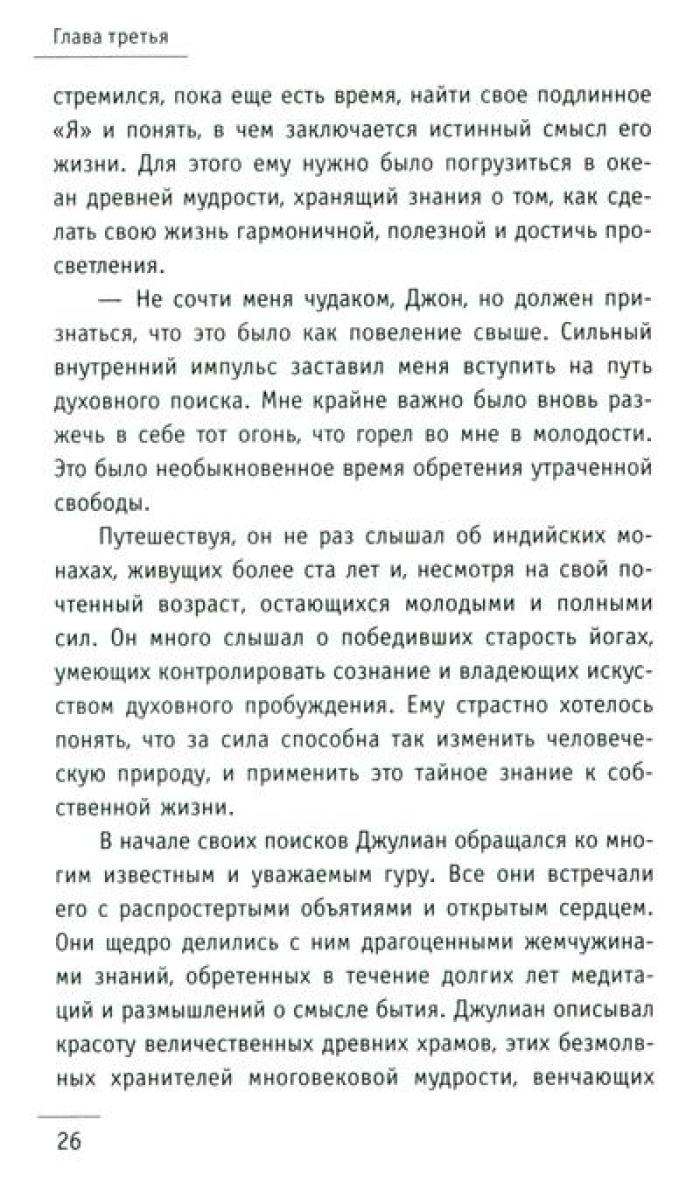 Притча "Монах, который продал свой „феррари“" проникает в сердце и мысли читателя, словно послание с небес, особенно важна она в трудные времена. В суете повседневных забот, среди множества жизненных мелочей человеку необходимо разглядеть действительно важные аспекты и ответить на сложные вопросы. Что такое подлинный успех и как его достичь? Можно ли обрести счастье, которое не зависит ни от карьерного роста, ни от мировых кризисов? Как избавиться от бесконечной заботы о завтрашнем дне и начать получать удовольствие от каждого прожитого дня? Существуют ли простые рецепты, позволяющие обрести духовные дары, не отказываясь от привычного комфорта? Как развить сверхспособности и подчинить себе судьбу? И, пожалуй, самое главное: как найти свое призвание и стать самим собой? Ответы – в этой книге! Вместе с бывшим миллионером Джулианом Мэнтлом вы совершите удивительное путешествие в Сивану – страну, где исполняются мечты!