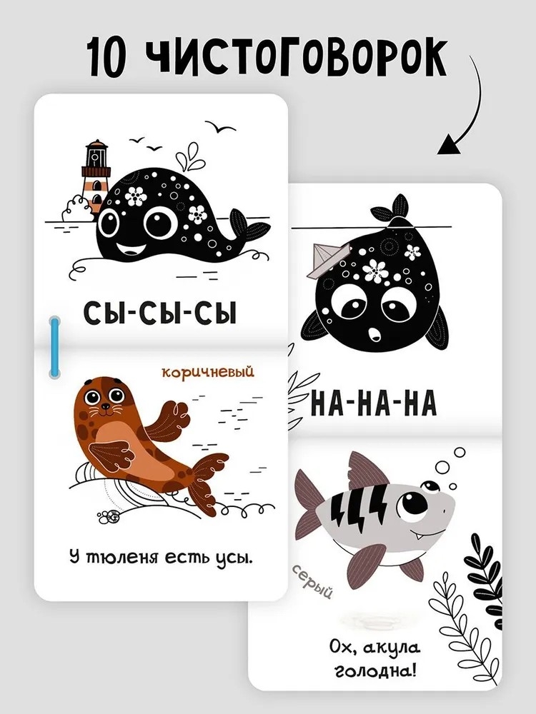 В каждой книжке вас ждут крупные черно-белые картинки с добавлением одного цвета и веселые рифмы – "говорилки".