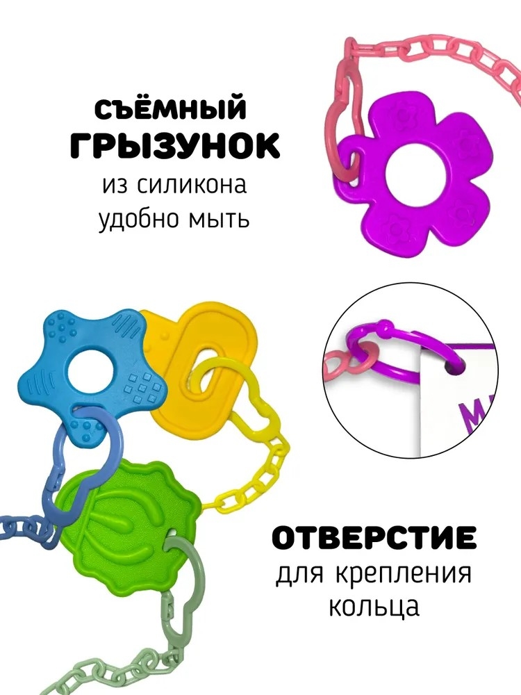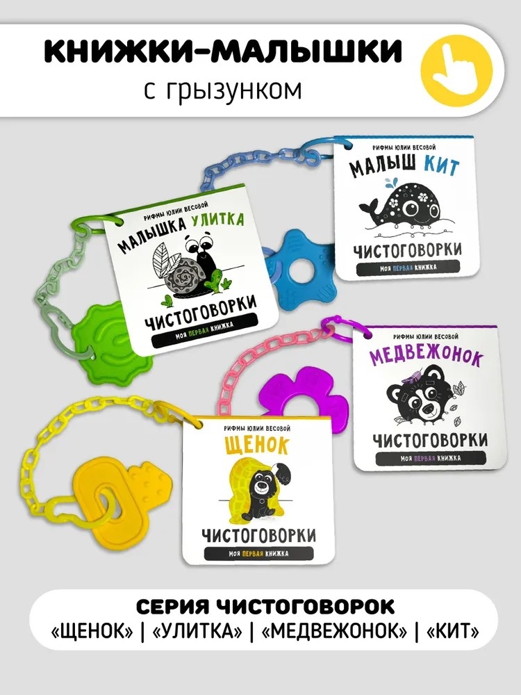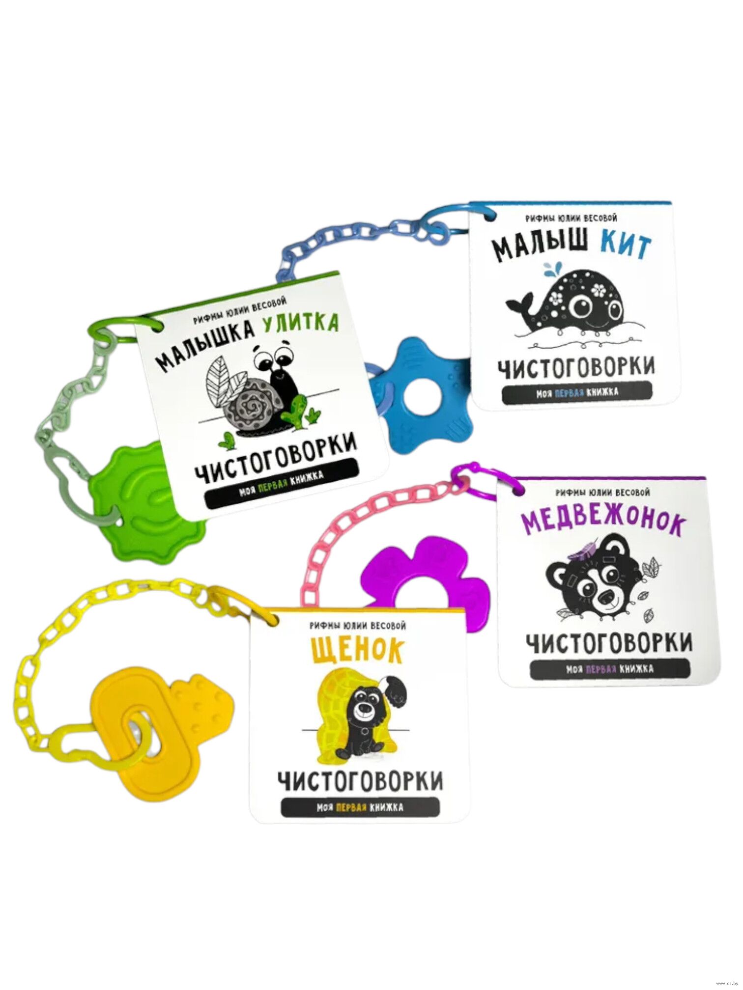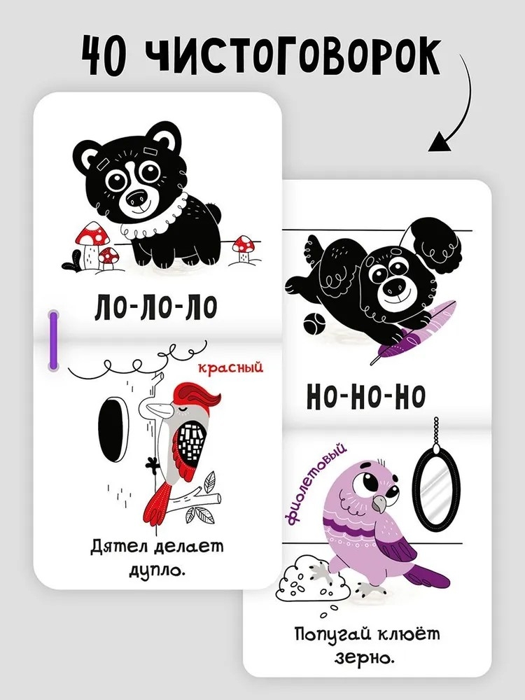 Карточки для новорожденных, удобно оформленные в виде книжки с грызунком. В книжке игрушке вас ждут крупные черно белые картинки с добавлением одного цвета и веселые рифмы – Говорилки, которые ускоряют запуск речи ребенка.