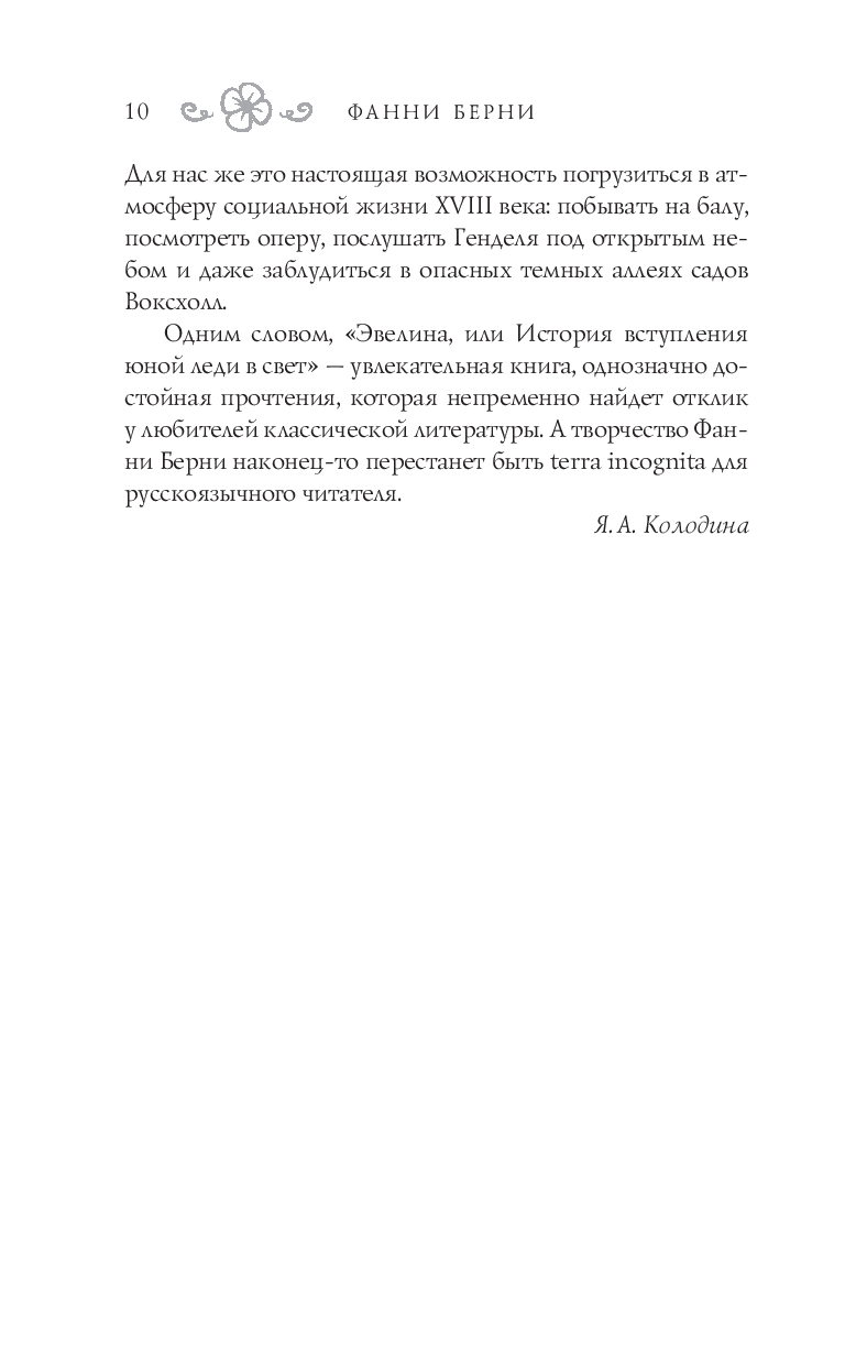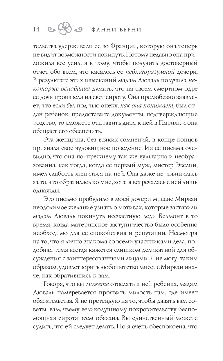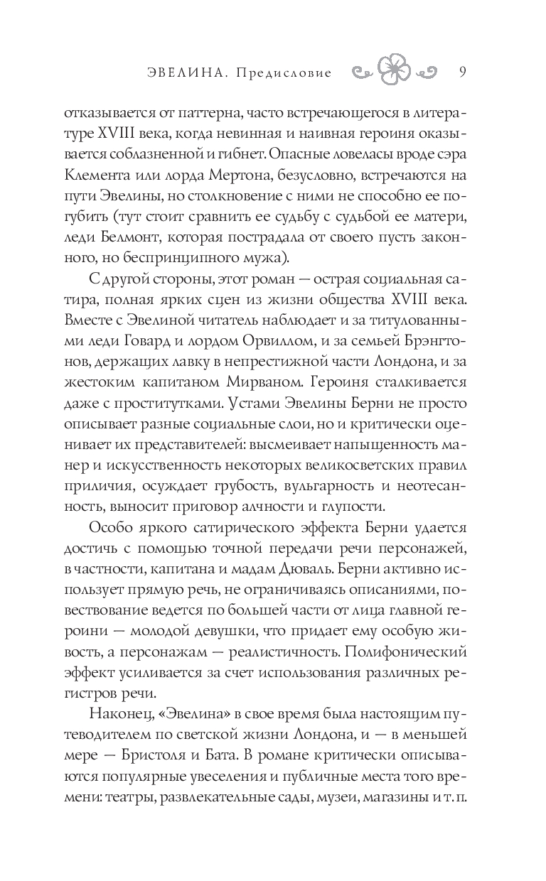 "Эвелина" – роман в письмах, впервые изданный анонимно в 1778 г. и сразу же ставший популярным среди читателей. Это настоящий путеводитель по Лондону XVIII века и в то же время острая социальная сатира, полная ярких сцен из жизни светского общества.