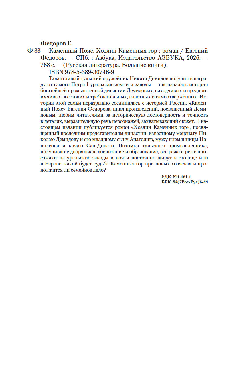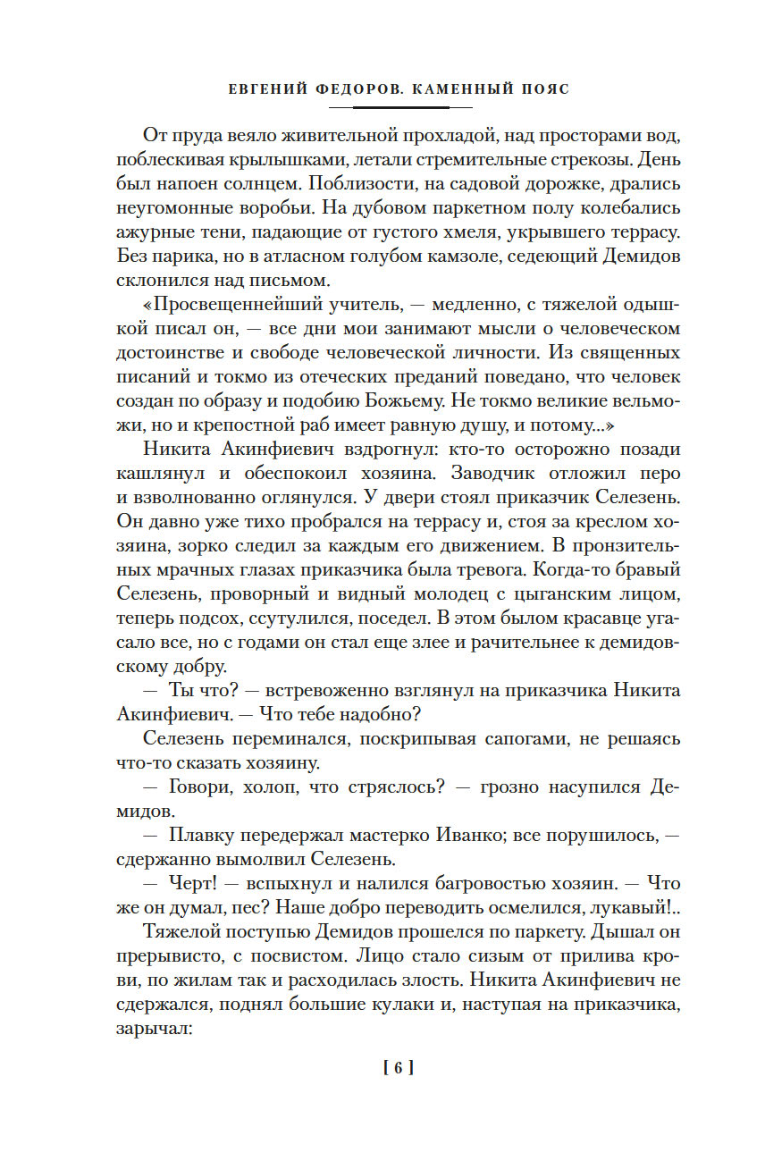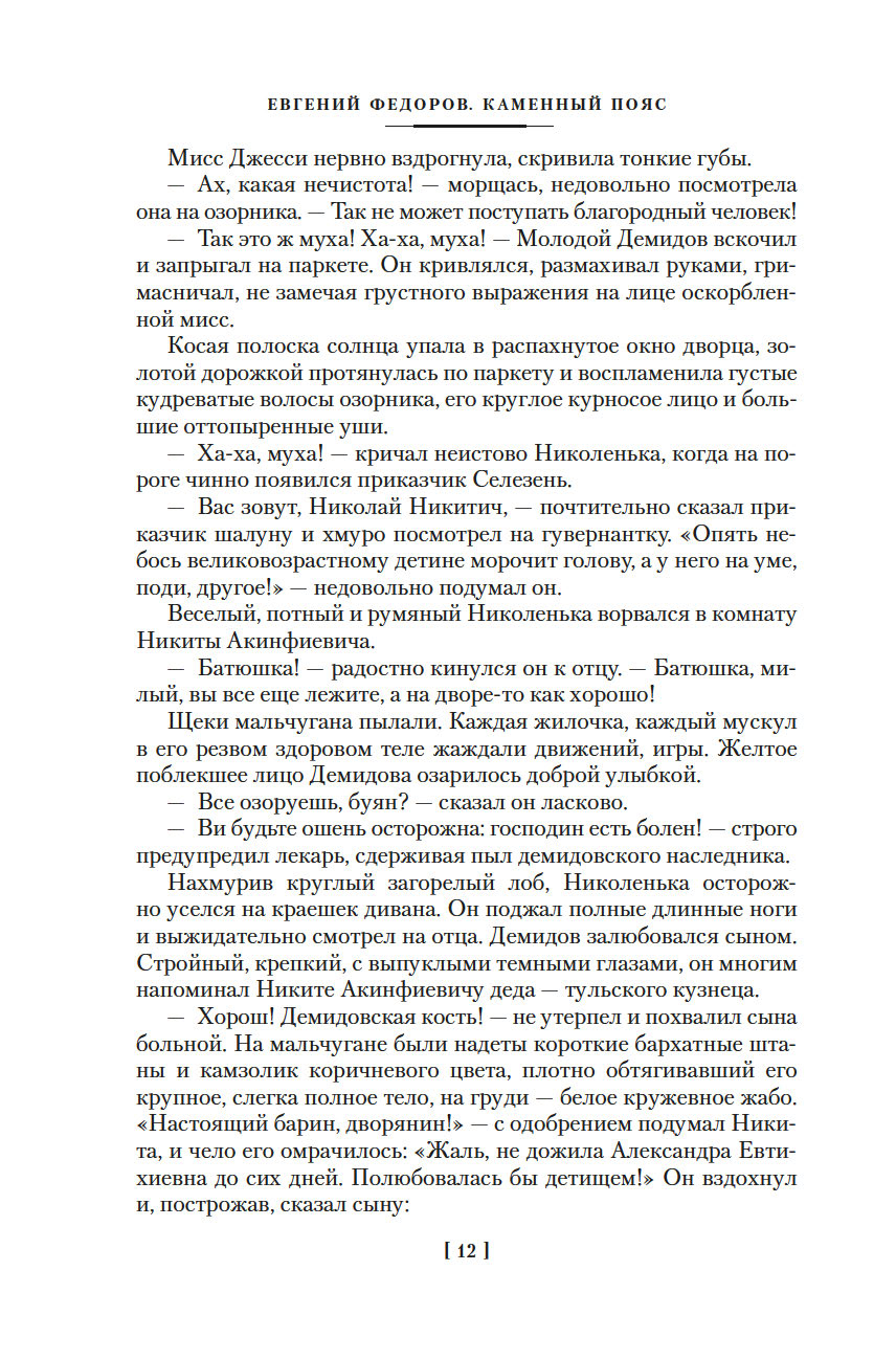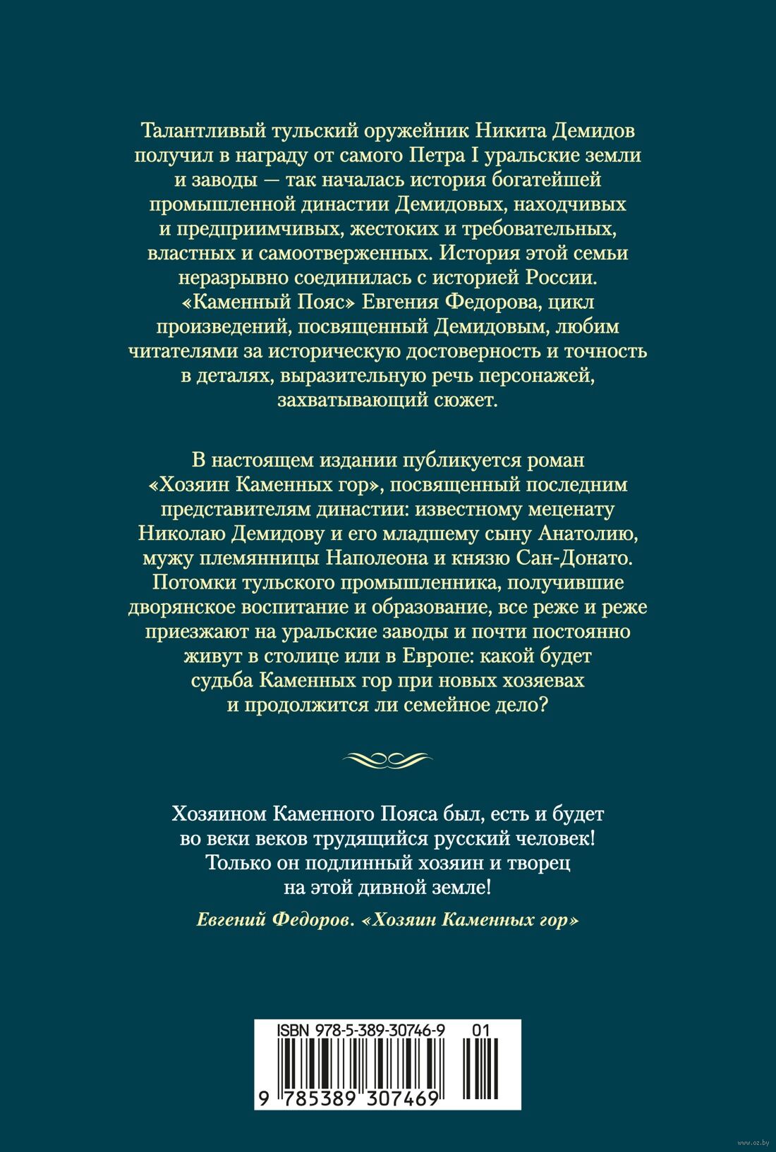 Талантливый тульский оружейник Никита Демидов получил в награду от самого Петра I уральские земли и заводы – так началась история богатейшей промышленной династии Демидовых, находчивых и предприимчивых, жестоких и требовательных, властных и самоотверженных. История этой семьи неразрывно соединилась с историей России. "Каменный Пояс" Евгения Федорова, цикл произведений, посвященный Демидовым, любим читателями за историческую достоверность и точность в деталях, выразительную речь персонажей, захватывающий сюжет.