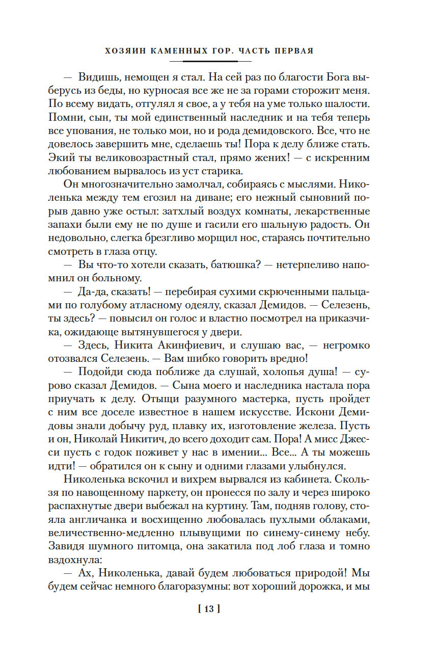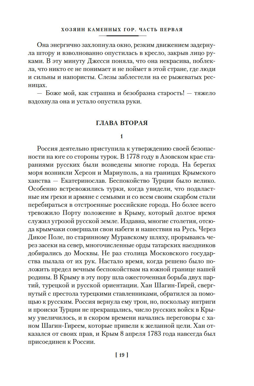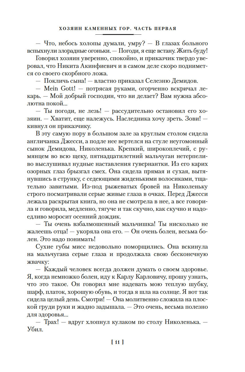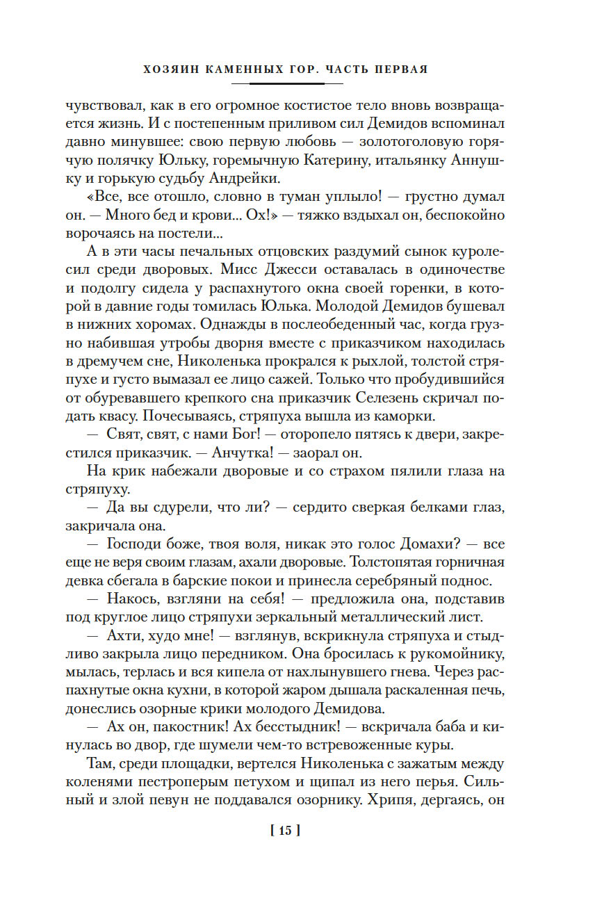 В настоящем издании публикуется роман "Хозяин Каменных гор", посвященный последним представителям династии: известному меценату Николаю Демидову и его младшему сыну Анатолию, мужу племянницы Наполеона и князю Сан-Донато. Потомки тульского промышленника, получившие дворянское воспитание и образование, все реже и реже приезжают на уральские заводы и почти постоянно живут в столице или в Европе: какой будет судьба Каменных гор при новых хозяевах и продолжится ли семейное дело?