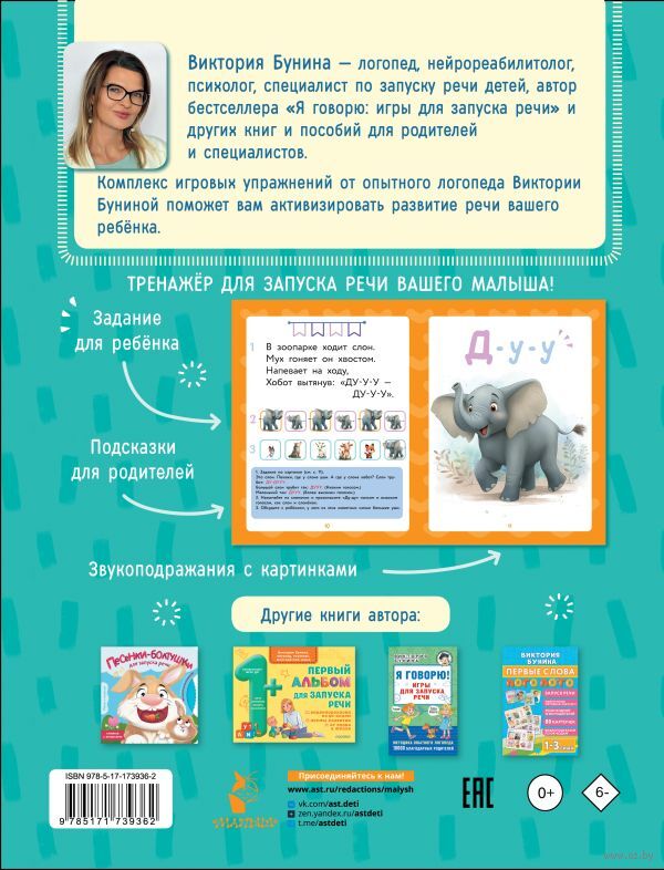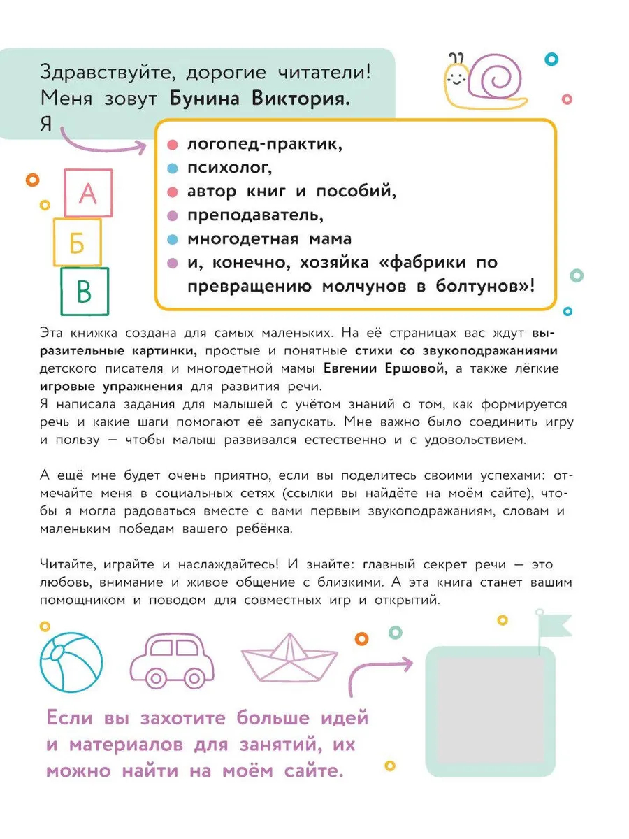 Комплекс игровых упражнений опытного логопеда Виктории Буниной поможет запустить речь и активизировать развитие вашего ребёнка. Виктория Бунина – автор методики запуска речи, эффективность которой подтвердили более 10 тыс. родителей. Увлекательные задания, специальные стихи-болтушки и крупные картинки привлекут внимание маленьких непосед. Подробные подсказки для родителей обеспечат эффективный результат занятий.