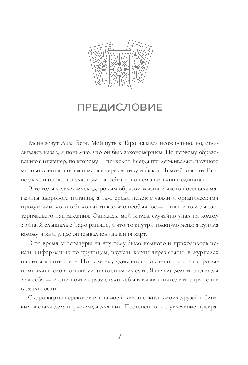Автор этой книги – Лада Берг, практикующий таролог, психолог и специалист в сфере отношений. Она начала работать с Таро более десяти лет назад и обладает ценными знаниями. Ее цель – сделать карты доступными и понятными для каждого.