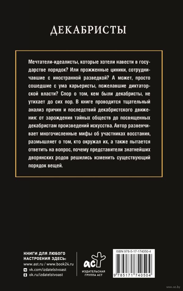 Мечтатели-идеалисты, которые хотели навести в государстве порядок? Или прожженные циники, сотрудничавшие с иностранной разведкой? А может, просто сошедшие с ума карьеристы, пожелавшие диктаторской власти? Спор о том, кем были декабристы, не утихает до сих пор. В книге проводится тщательный анализ причин и последствий декабристского движения: от зарождения тайных обществ до посвященных декабристам произведений искусства. Автор развенчивает многочисленные мифы об участниках восстания, размышляет о том, кто окружал их, а также пытается ответить на вопрос, почему представители знатнейших дворянских родов решились изменить существующий порядок вещей.