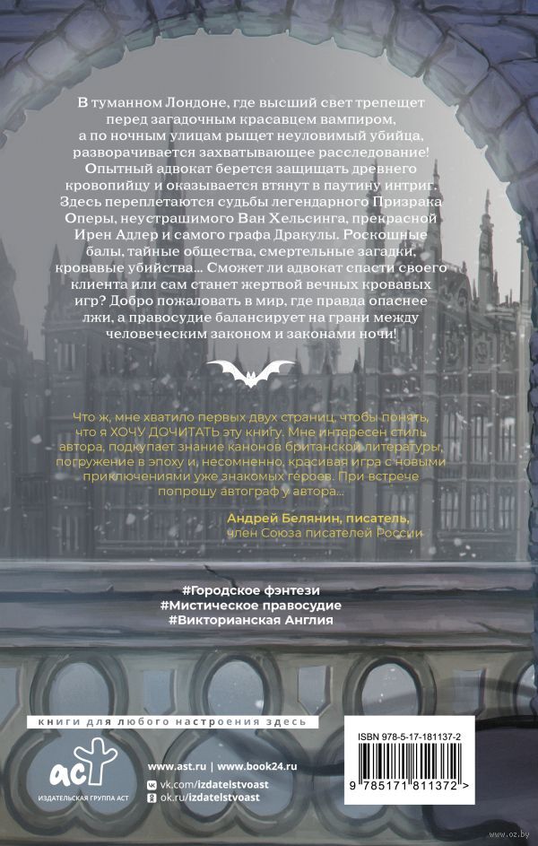 В туманном Лондоне, где высший свет трепещет перед загадочным красавцем-вампиром, а по ночным улицам рыщет неуловимый убийца, разворачивается захватывающее расследование! Опытный адвокат берется защищать древнего кровопийцу, обвиняемого в серии преступлений, и оказывается втянут в паутину интриг. Здесь переплетаются судьбы легендарного Призрака Оперы, неустрашимого Ван Хельсинга, прекрасной Ирен Адлер и самого графа Дракулы. Роскошные балы, тайные общества, смертельные загадки, кровавые убийства. Сможет ли адвокат доказать невиновность своего клиента или сам станет жертвой кровавых игр бессмертных? Добро пожаловать в мир, где правда опаснее лжи, а правосудие балансирует на грани между человеческим законом и законами ночи!