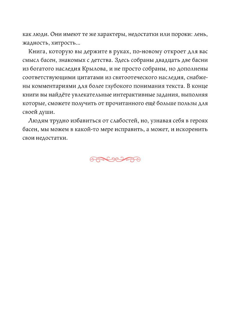 Книга, которую вы держите в руках, по-новому откроет для вас смысл басен, знакомых с детства. Здесь собраны двадцать две басни из богатого наследия Крылова, и не просто собраны, но дополнены соответствующими цитатами из святоотеческого наследия, снабжены комментариями для более глубокого понимания текста.