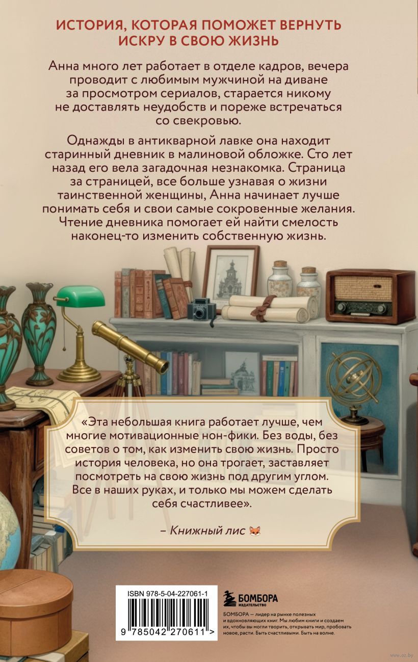 Однажды в антикварной лавке она находит старинный дневник в малиновой обложке. Сто лет назад его вела загадочная незнакомка. Страница за страницей, все больше узнавая о жизни таинственной женщины, Анна начинает лучше понимать себя и свои самые сокровенные желания. Чтение дневника помогает ей найти смелость наконец-то изменить собственную жизнь.