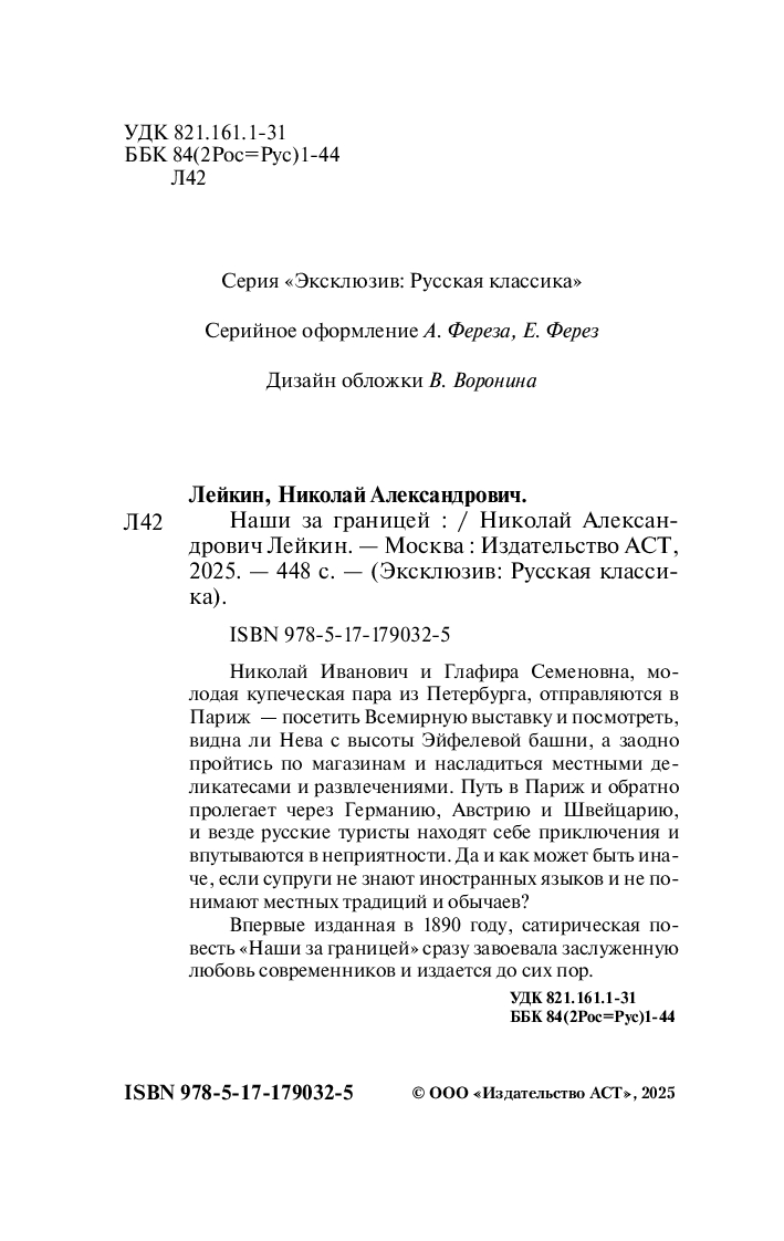 Впервые изданная в 1890 году, сатирическая повесть "Наши за границей" сразу завоевала заслуженную любовь современников и издается до сих пор.