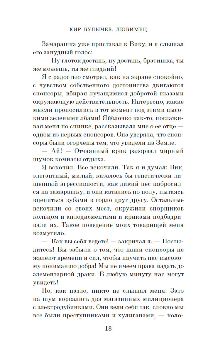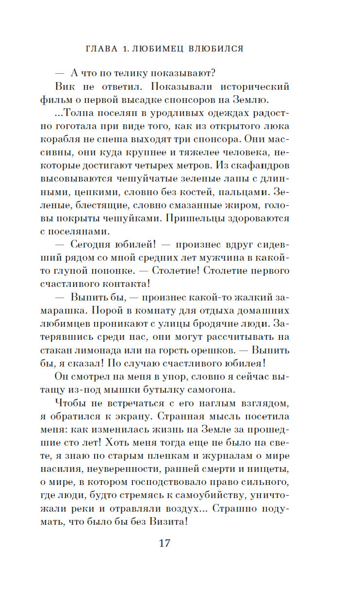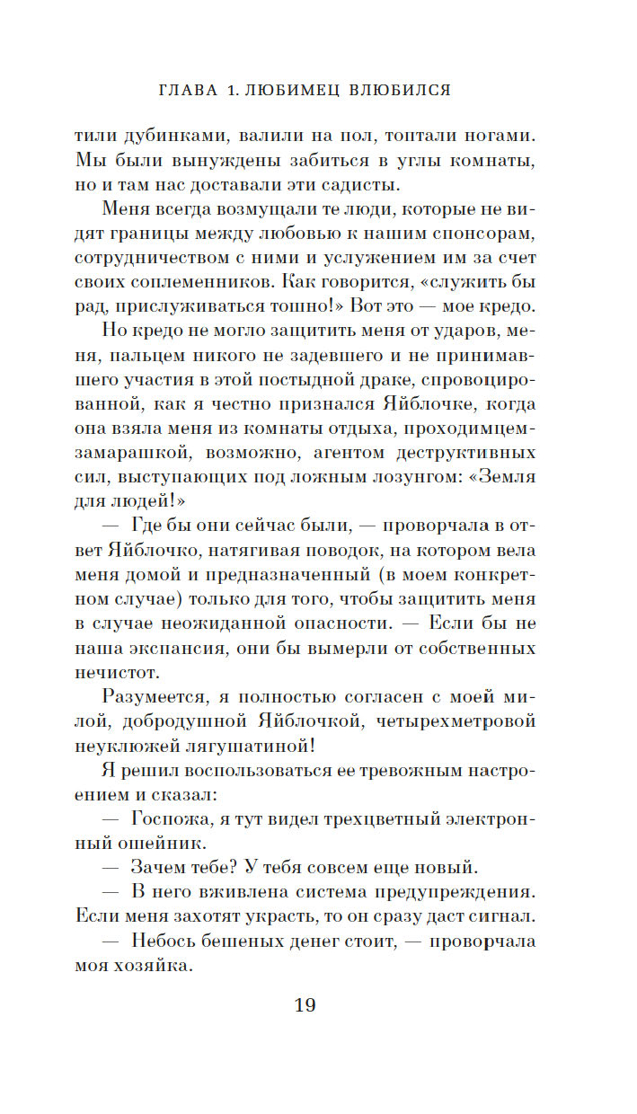 Любимец. Это что-то вроде домашней кошечки или собачки, только в человечьем обличье. Живут такие любимцы в специально выделенных помещениях с предупреждением над дверью: "Вход без намордников воспрещен". Хозяева любимцев, их называют спонсорами, – крупные инопланетные особи ростом до четырех метров, много тяжелее и массивнее человека. С чешуйчатыми зелеными лапами и цепкими, будто бы без костей, пальцами. Дело в том, что их родную планету нужно было спасать от перенаселения, вот часть ее обитателей и переместили сюда, на Землю, человечеству на погибель...