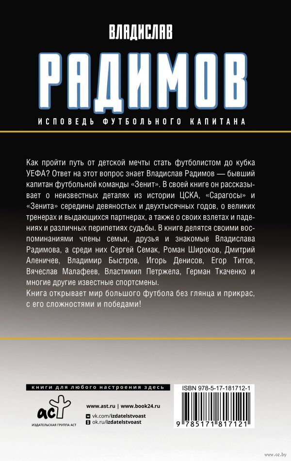 Как пройти путь от детской мечты стать футболистом до кубка УЕФА? Ответ на этот вопрос знает Владислав Радимов – бывший капитан футбольной команды "Зенит". В своей книге он рассказывает о неизвестных деталях из истории ЦСКА, "Сарагосы" и "Зенита" середины девяностых и двухтысячных годов, о великих тренерах и выдающихся партнерах, а также о своих взлетах и падениях и различных перипетиях судьбы. В книге делятся своими воспоминаниями члены семьи, друзья и знакомые Владислава Радимова, а среди них Сергей Семак, Роман Широков, Дмитрий Аленичев, Владимир Быстров, Игорь Денисов, Егор Титов, Вячеслав Малафеев, Властимил Петржела, Герман Ткаченко и многие другие известные спортсмены.