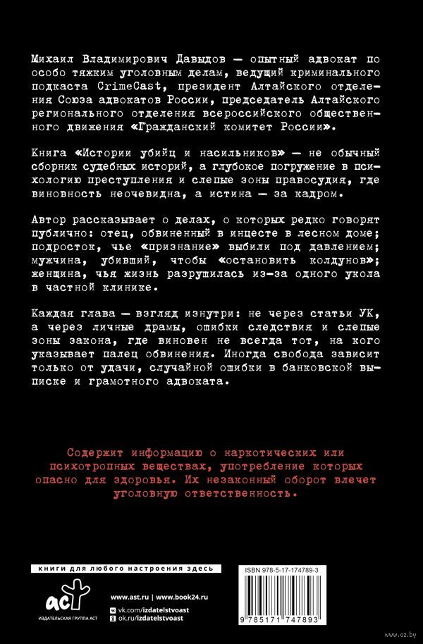 Книга "Истории насильников и убийц" – не обычный сборник судебных историй, а глубокое погружение в психологию преступления и слепые зоны правосудия, где виновность неочевидна, а истина – за кадром. Автор рассказывает о делах, о которых редко говорят публично: отец, обвиненный в инцесте в лесном доме; подросток, чьё "признание" выбили давлением; мужчина, убивший, чтобы "остановить колдунов"; женщина, чья жизнь разрушилась из-за одного укола в частной клинике.