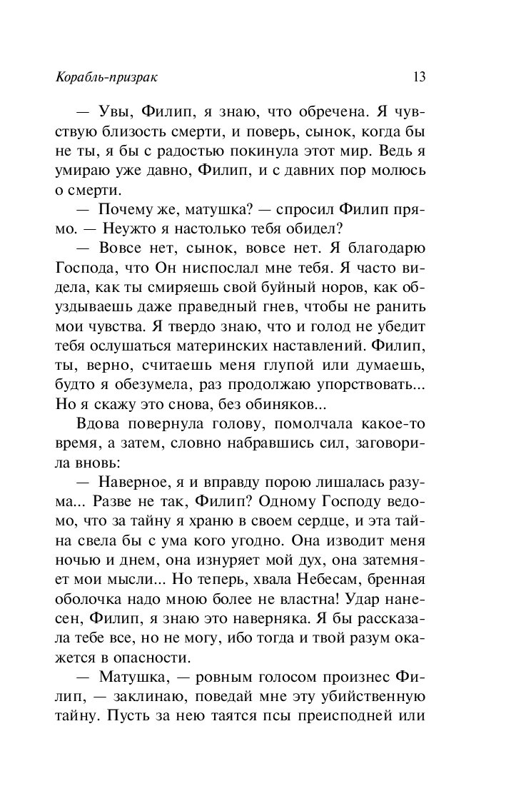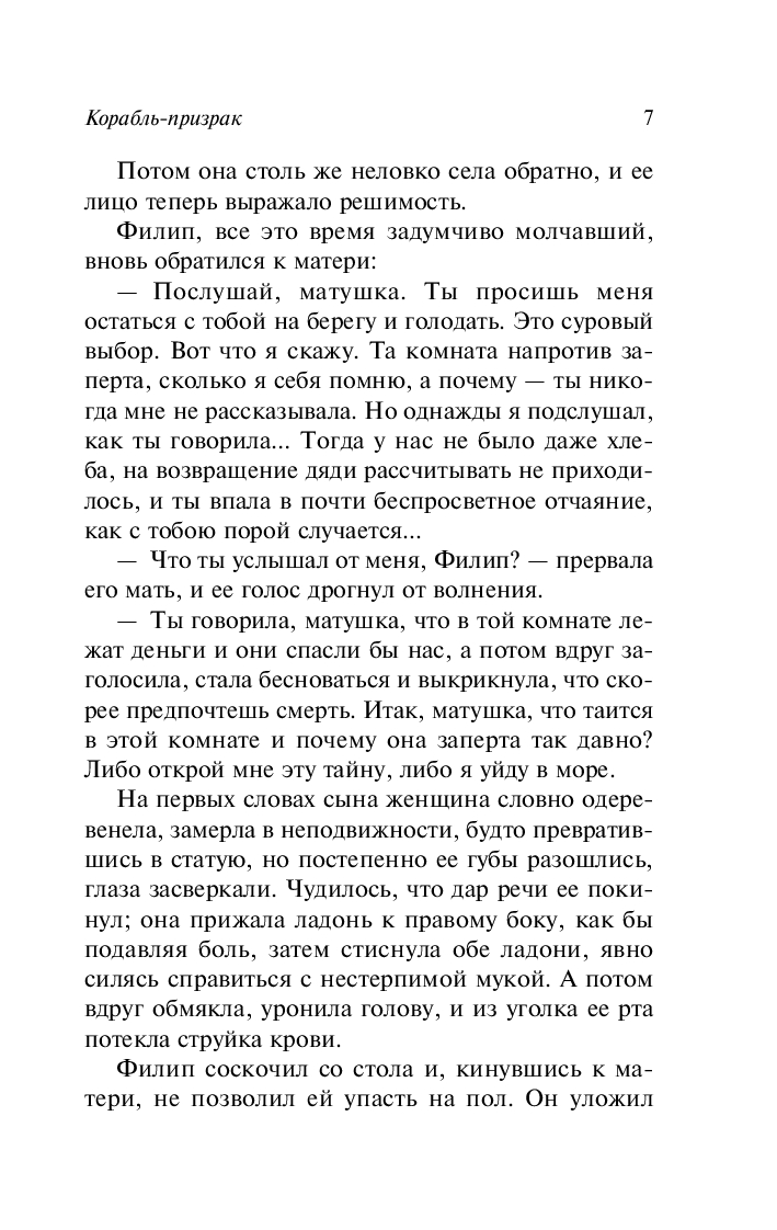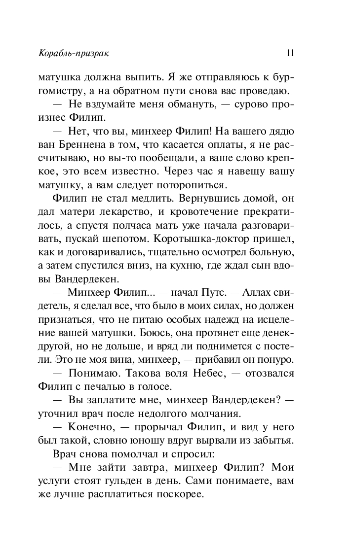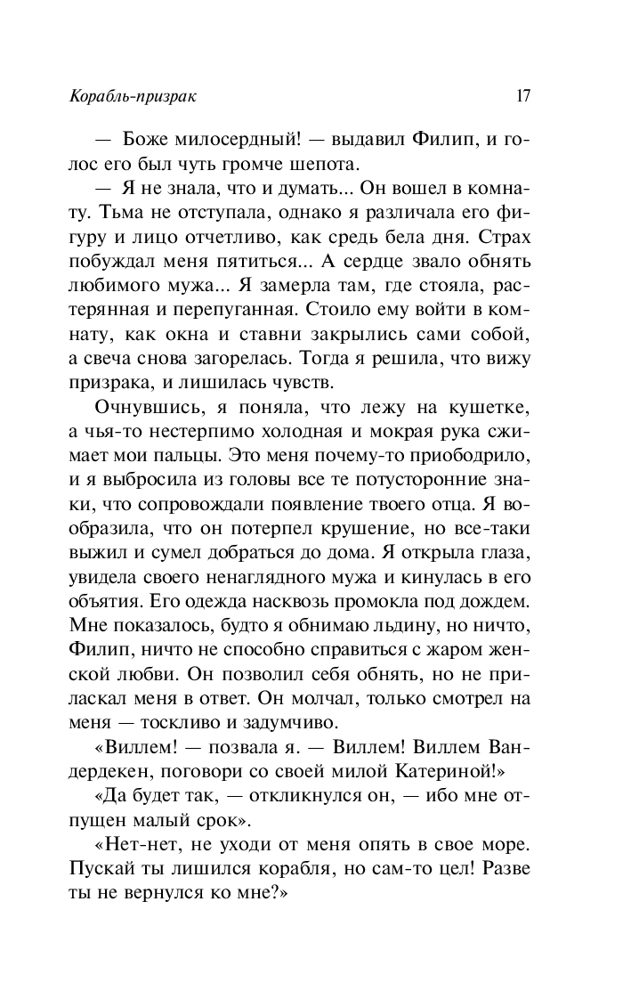 Корабль-призрак – роман, в основе которого – легенда о "Летучем голландце", корабле-призраке, вечно скитающемся по морям и океанам, наводя ужас на мореплавателей. Молодой человек Филип Вандердекен должен снять проклятие со своего отца-капитана, наказанного за богохульство и убийство одного из членов экипажа…