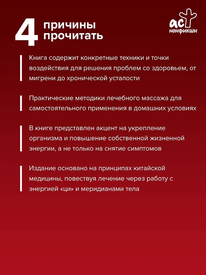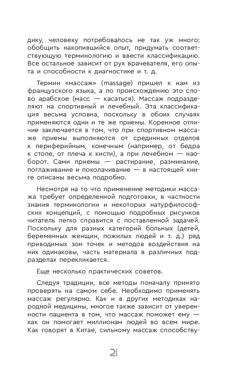 Когда нас мучают головные боли, проблемы с желудком, геморрой или ангина, мы начинаем горстями глотать таблетки и ждать чуда. Но эффект от лекарств всегда временный – и уже спустя несколько дней проблемы возвращаются. А наш организм обладает уникальной энергетикой, способной победить любой недуг, достаточно лишь восстановить правильные энергетические потоки в органах. Эта книга откроет тайны нашего тела, его энергетические точки и способы воздействия на них. Вы узнаете, что такое 14 меридианов организма и воздействие пяти элементов на различные заболевания, познакомитесь с методикой массажа и терминологией. Как говорят в Китае, сильному человеку массаж позволяет продлить жизнь, слабому – одолеть недуги и восстановить здоровье. Восточный массаж – эффективное средство предупреждения и лечения большинства болезней, он поможет сохранить здоровье, бодрость и отличное настроение.