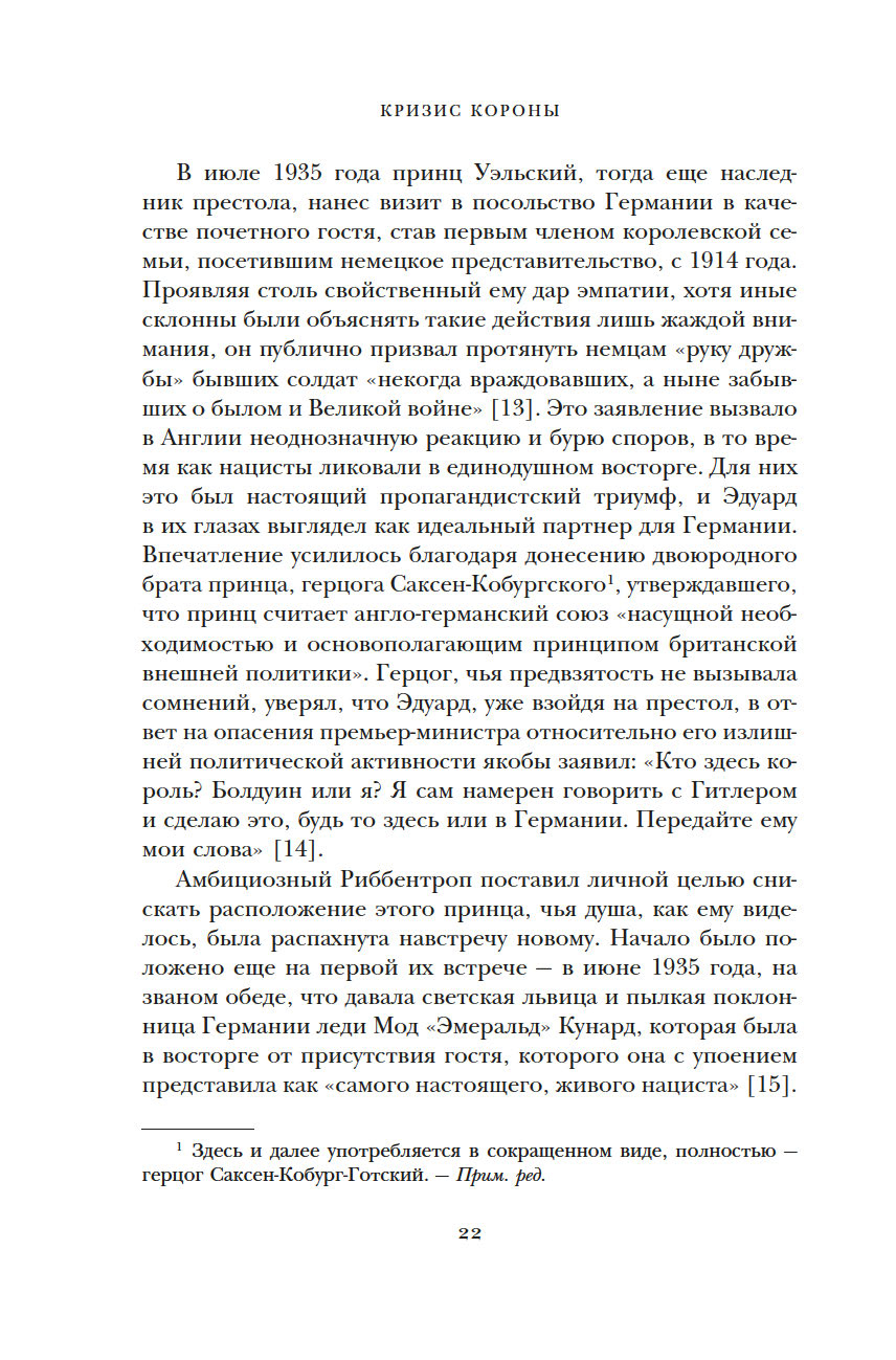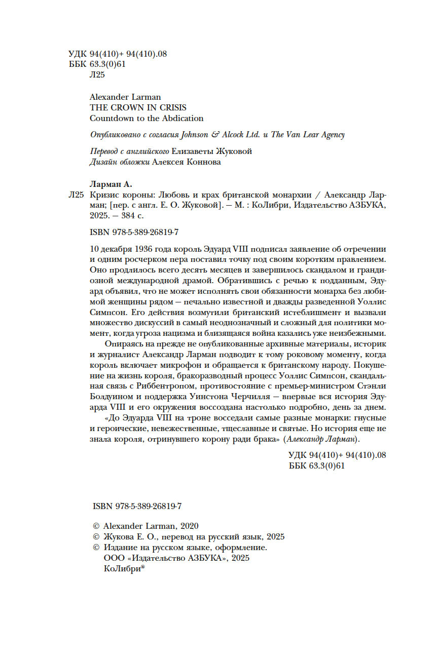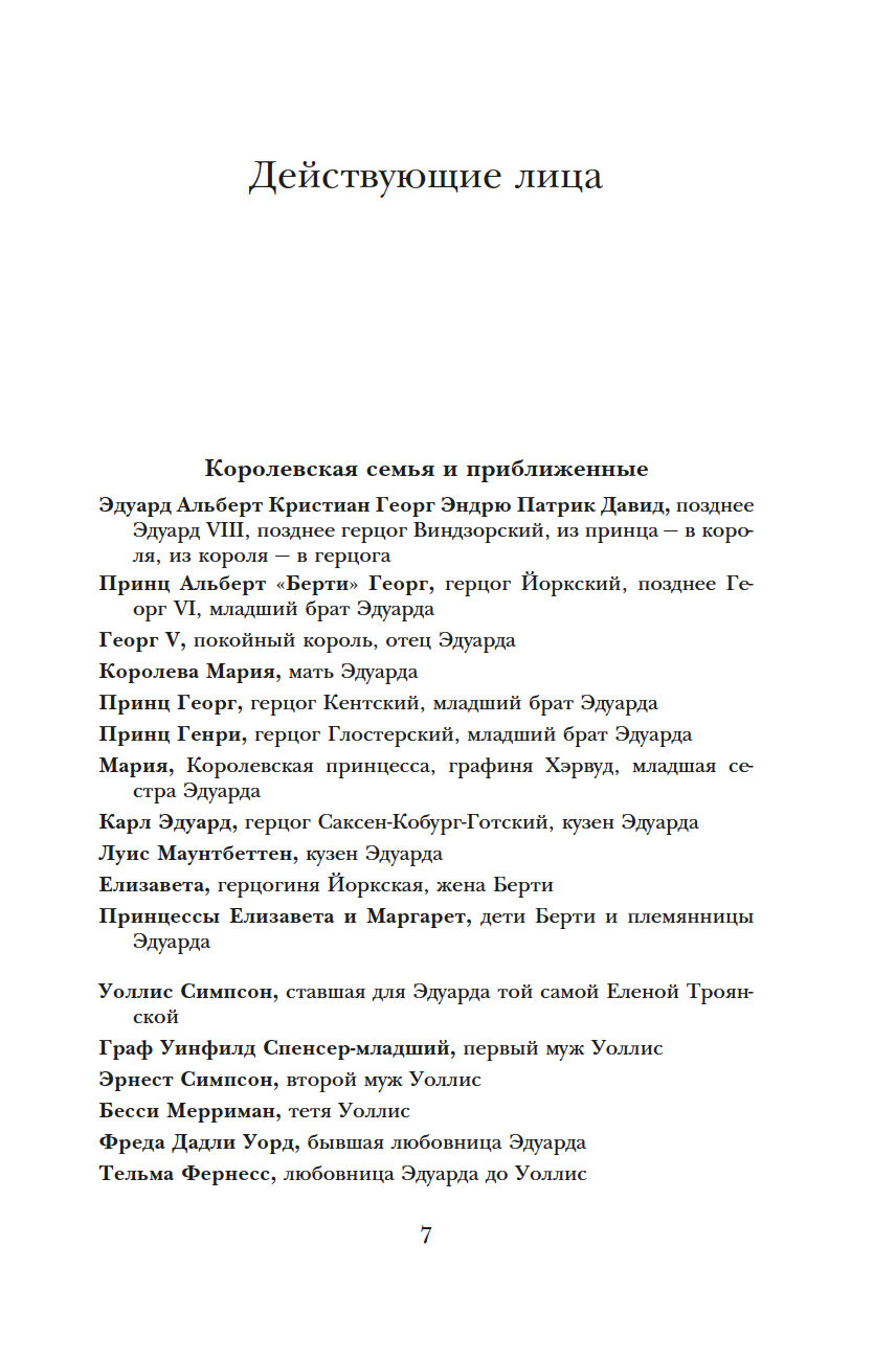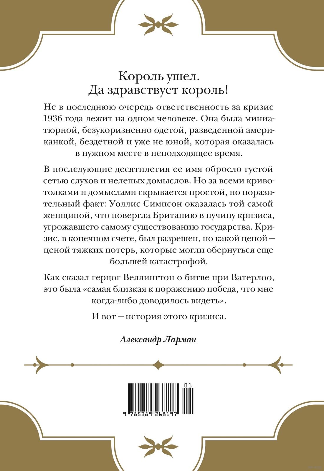 Опираясь на прежде не опубликованные архивные материалы, историк и журналист Александр Ларман подводит к тому роковому моменту, когда король включает микрофон и обращается к британскому народу. Покушение на жизнь короля, бракоразводный процесс Уоллис Симпсон, скандальная связь с Риббентропом, противостояние с премьер- министром Стэнли Болдуином и поддержка Уинстона Черчилля – впервые вся история Эдуарда VIII и его окружения воссоздана настолько подробно, день за днем.