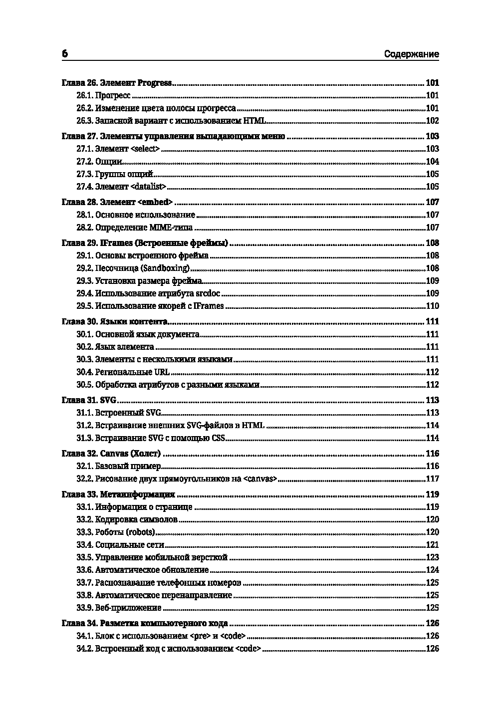 Книга охватывает современные возможности HTML5: адаптивные изображения, встроенные аудио- и видеоплееры, элемент <canvas> и SVG-графику, работу с ARIA-атрибутами для доступности, использование метаинформации и глобальных атрибутов. Приведены практические советы по оптимальной разметке, поддержке кросс-браузерности и улучшению UX.