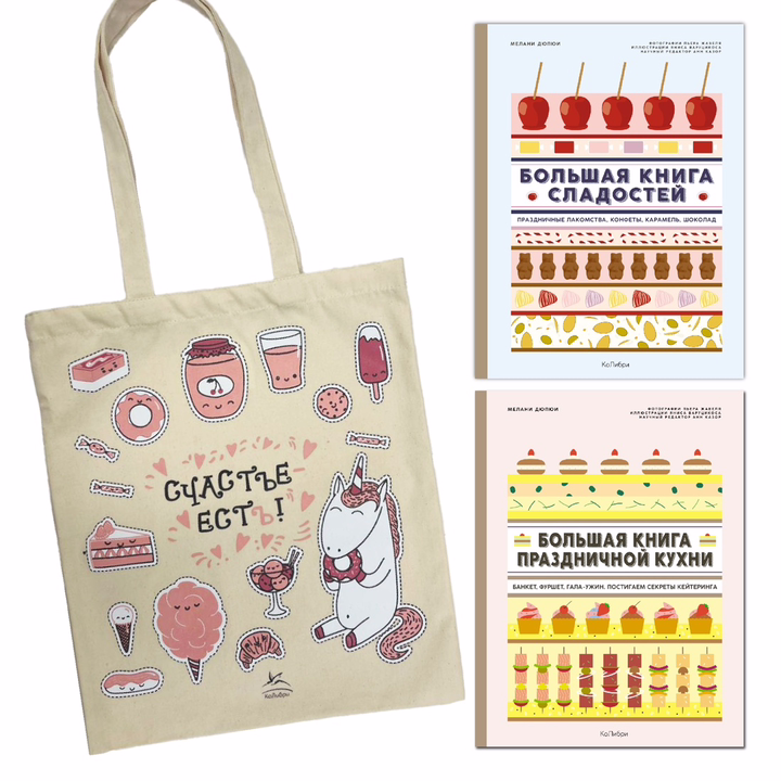 Комплект из яркого шоппера и двух действительно больших книг про сладости и праздничные блюда. Известный повар Франции, Мелани Дюпюи, и научный редактор Анн Казор создали книги, которые порадуют профессионалов и помогут улучшить кулинарные навыки любителям! Полезный подарок для мамы, бабушки, сестры и подруги.