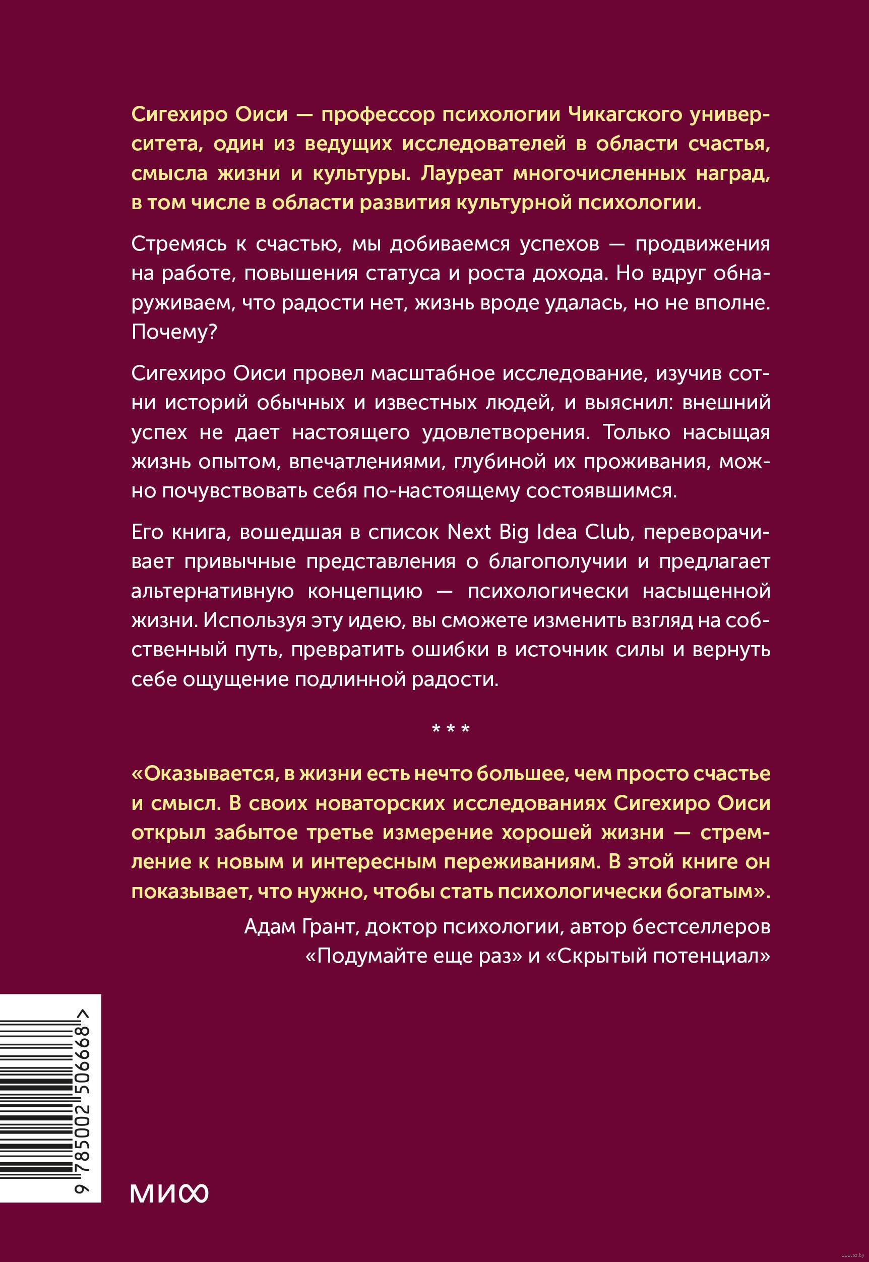 Стремясь к счастью, мы добиваемся успехов – продвижения на работе, повышения статуса и роста дохода. Но вдруг обнаруживаем, что радости нет, жизнь вроде удалась, но не вполне. Почему? Психолог Сигехиро Оиси провел масштабное исследование, изучив сотни историй обычных и известных людей, и выяснил: внешний успех не дает настоящего удовлетворения. Только насыщая жизнь опытом, впечатлениями, глубиной их проживания, можно почувствовать себя по-настоящему состоявшимся.