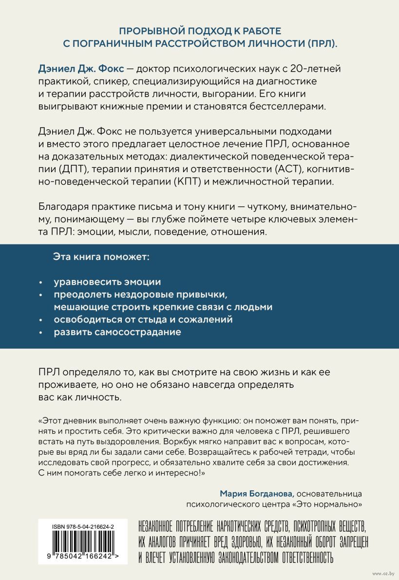 Рабочая тетрадь для людей с пограничным расстройством личности поможет услышать себя, уравновесить эмоции, научиться заботиться о себе и преодолеть нездоровые привычки. Основываясь на доказательных методах, Дэниэл Фокс сохраняет чуткость и дружелюбие, чтобы вы помнили: даже если ПРЛ определяло, что вы думаете и как проживаете жизнь, оно не определяет вашу личность и выбор пути.