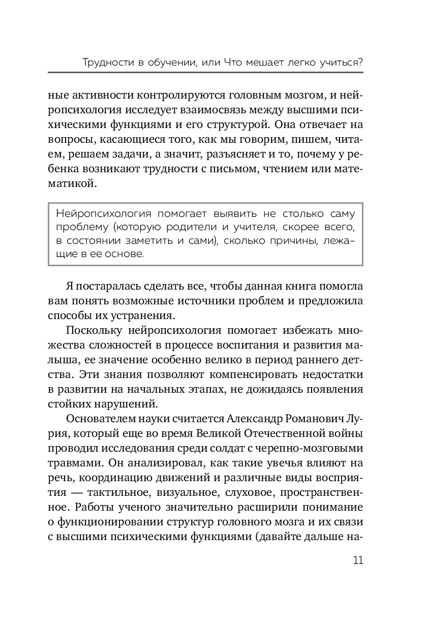 У каждой трудности есть своя причина, и она кроется в работе мозга. Нейропсихолог Елена Лаштабега поможет понять, что мешает вашему ребенку учиться спокойно и с удовольствием, и подскажет, как это исправить. Она объяснит, как справляться с потерей концентрации, переутомлением и гиперактивностью, поделится конкретными методиками, которые помогут школьникам легко воспринимать материал на слух, быстро усваивать прочитанное и дольше удерживать внимание. Вы получите практические упражнения для развития памяти, мышления и внимания, а также узнаете, как превратить "зубрежку" в осознанное и интересное обучение.