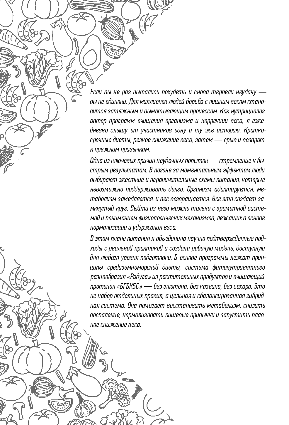Практичное пособие, объединившее в себе всю самую полезную и важную информацию для тех, кто мечтает сбросить вес. Здесь вы найдете не просто общие рекомендации и советы, а четкое руководство к действию с трекерами привычек, доступом к онлайн-калькулятору расчета идеального для вас веса, готовыми списками продуктов и более чем сотне скучных, полезных и разнообразных рецептов. Эта книга предлагает революционный подход к снижению веса и укреплению здоровья, объединивший три научно обоснованные системы питания: средиземноморскую диету, диету Радуга и принципы "БГБКБС" (без глютена, казеина и сахара). Внутри вас ждет готовое решение – 4-недельная программа с проработанным меню на каждый день.