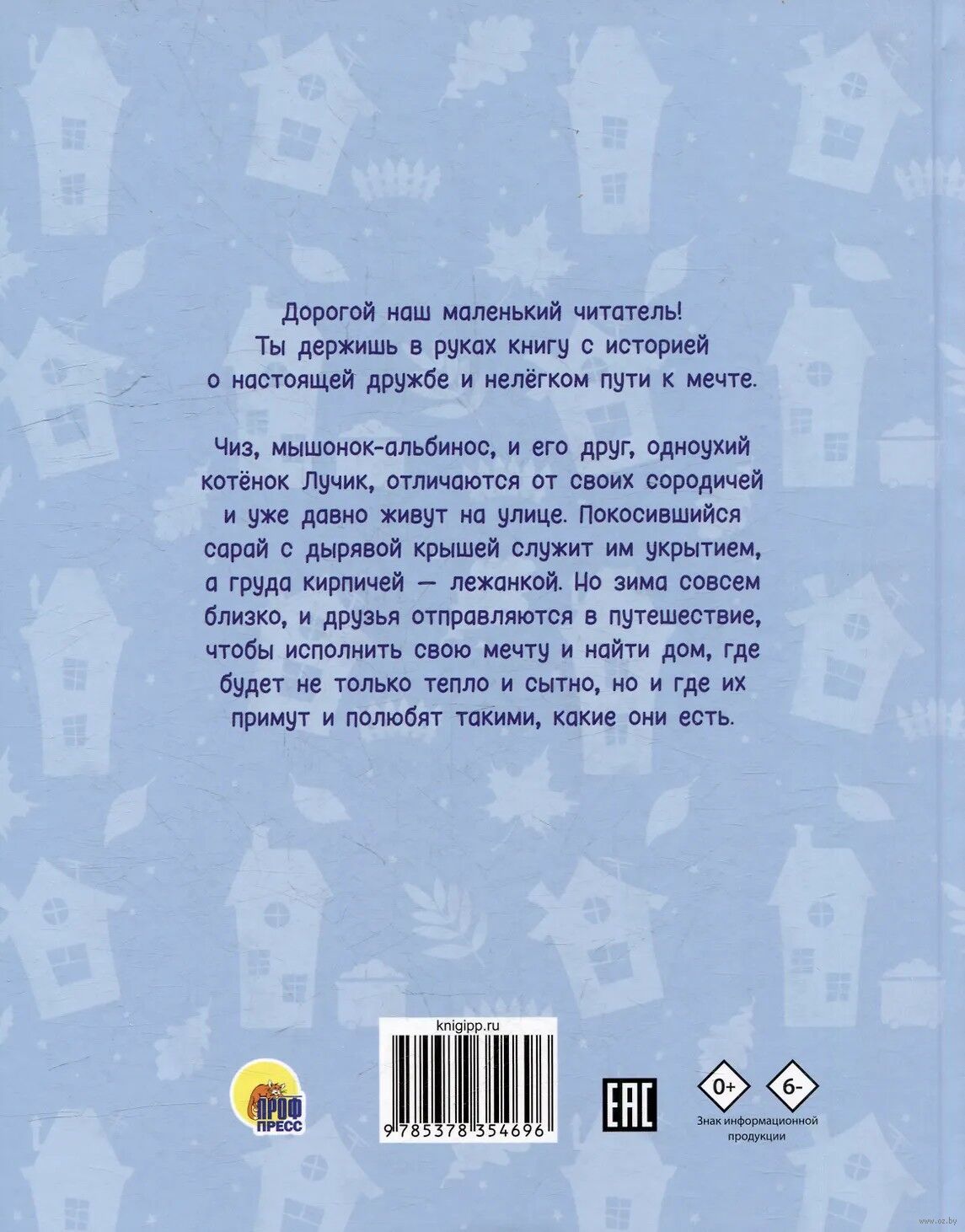 Дорогой наш маленький читатель! Ты держишь в руках книгу с историей о настоящей дружбе и нелёгком пути к мечте. Чиз, мышонок-альбинос, и его друг, одноухий котёнок Лучик, отличаются от своих сородичей и уже давно живут на улице.