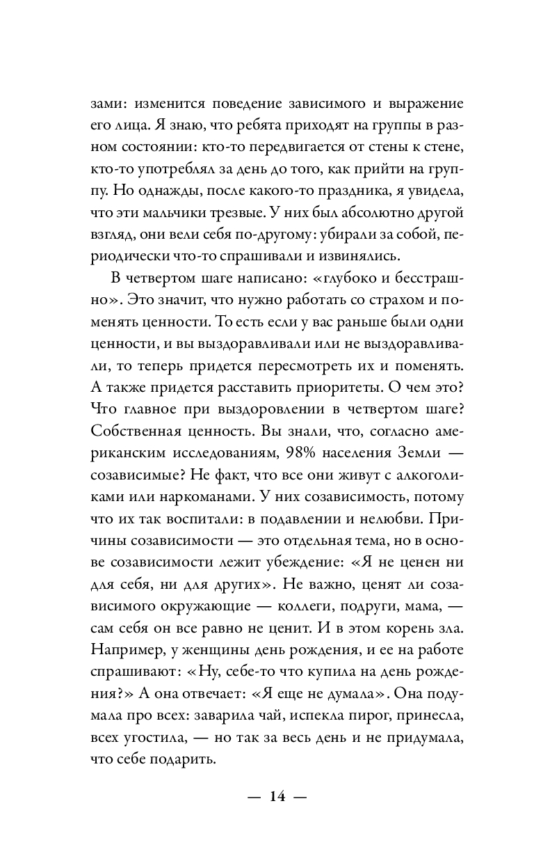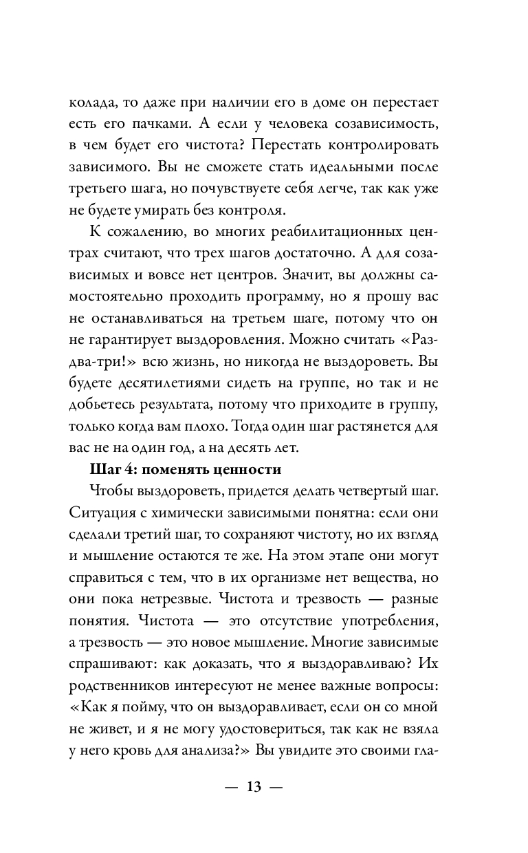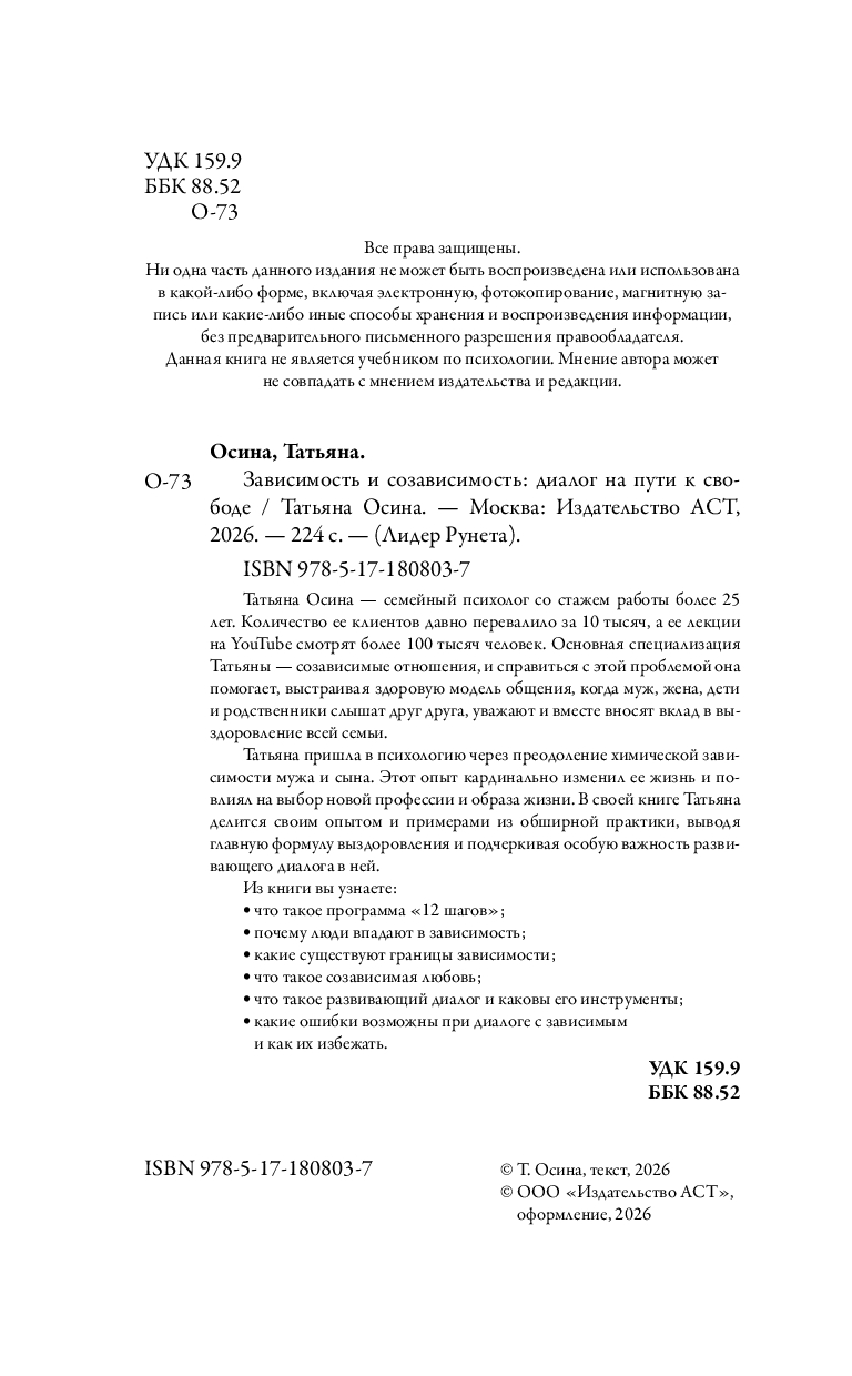 Татьяна пришла в психологию через преодоление химической зависимости мужа и сына. Этот опыт кардинально изменил ее жизнь и повлиял на выбор новой профессии и образа жизни. В своей книге Татьяна делится своим опытом и примерами из обширной практики, выводя главную формулу выздоровления и подчеркивая особую важность развивающего диалога в ней.