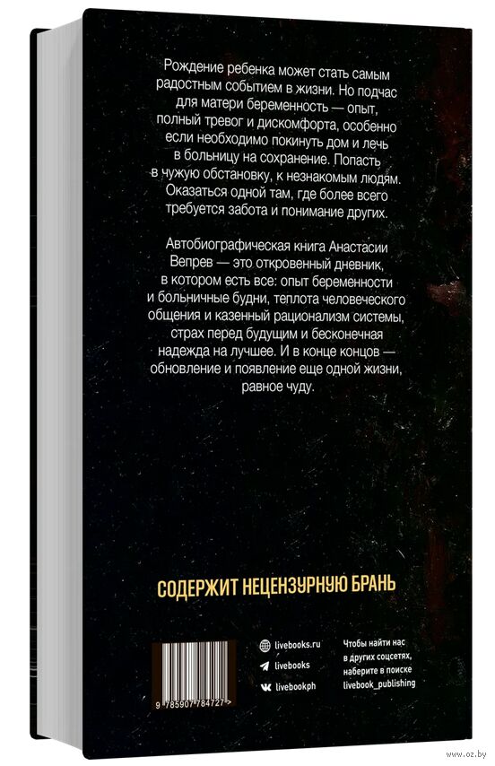 Автобиографическая книга Анастасии Вепрев — это откровенный дневник, в котором есть всё: опыт беременности и больничные будни, теплота человеческого общения и казённый рационализм системы, страх перед будущим и бесконечная надежда на лучшее. И в конце концов – обновление и появление ещё одной жизни, равное чуду.