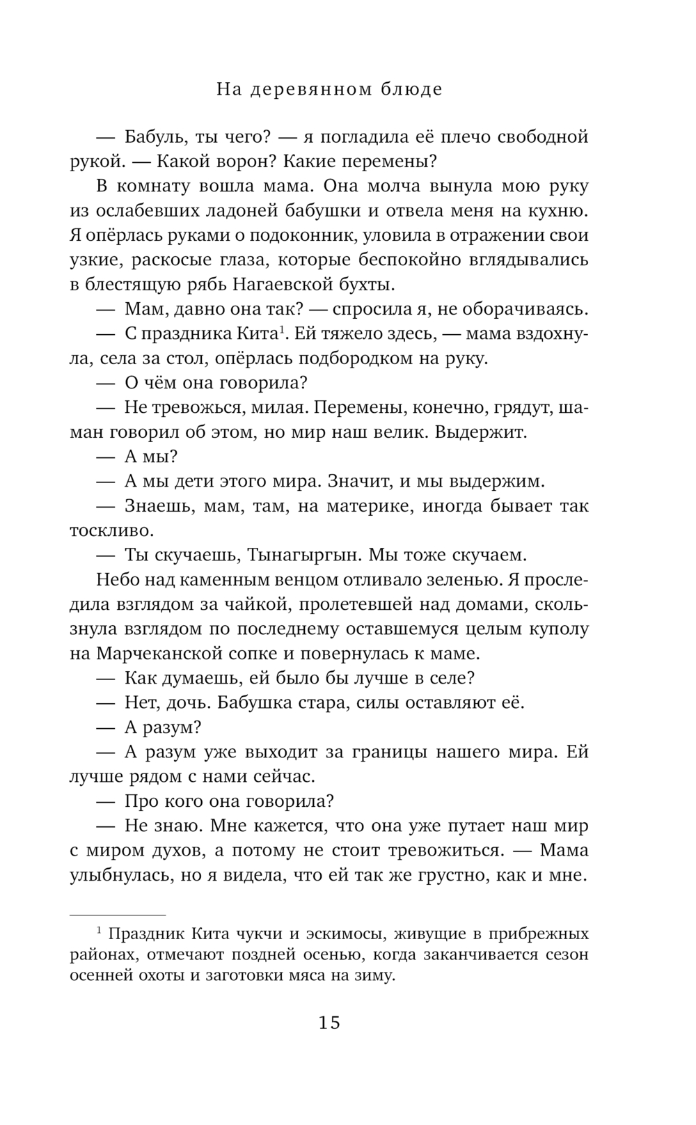 Если бабушка-шаманка оставляет тебе в наследство древнее блюдо, способное вызвать из небытия хоть бутерброд, хоть курсовик по специальности, – будь готова к тому, что скоро в твою жизнь придут чудеса. Бестелесные голоса на рассвете окликнут по имени: "Иди к нам, Тынагыргын!" Прибежит мышка Вувыльту и расскажет о скором пробуждении создателя и разрушителя миров – великого Ворона Кутха. А самое главное, ты ощутишь взгляд, неотступно наблюдающий за тобой из темноты.