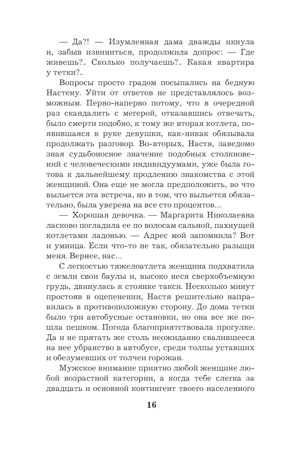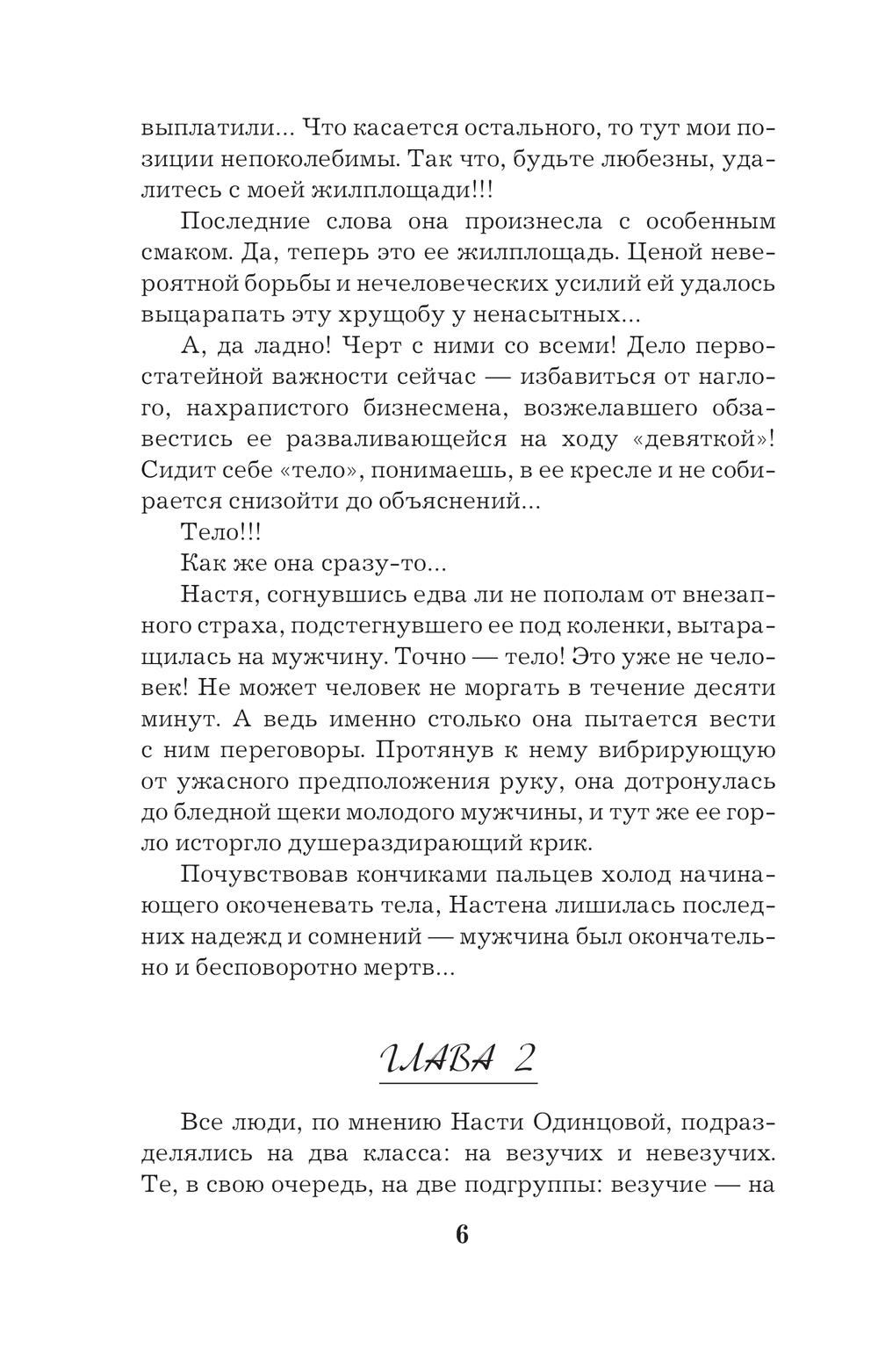 Вернувшись домой, Настя Одинцова обнаруживает в кресле труп местного криминального авторитета Ивана Мельника. А ведь всего полчаса назад они вместе ужинали в ресторане! Конечно, она постарается как можно быстрее избавиться от находки. Увы, это не очень помогает: девушку преследуют бандиты, с ней жаждут поговорить полицейские. Вдобавок еще и в женихи к Насте навязываются разные подозрительные личности. Самое время брать судьбу в собственные руки!..