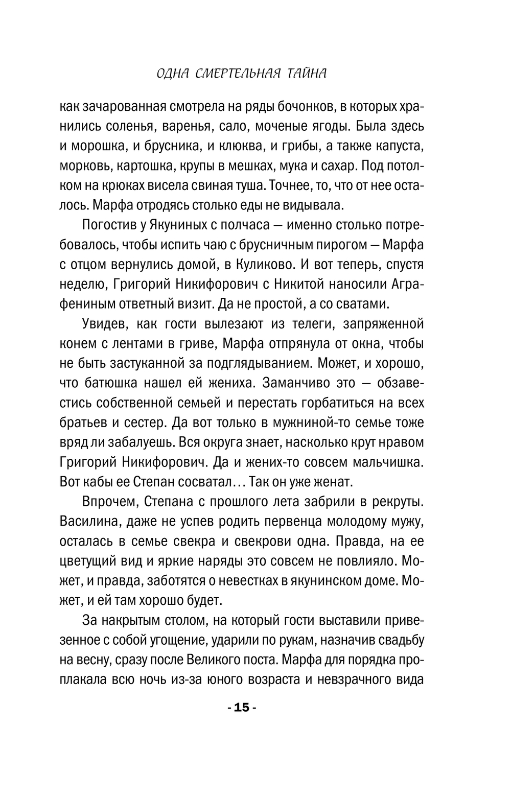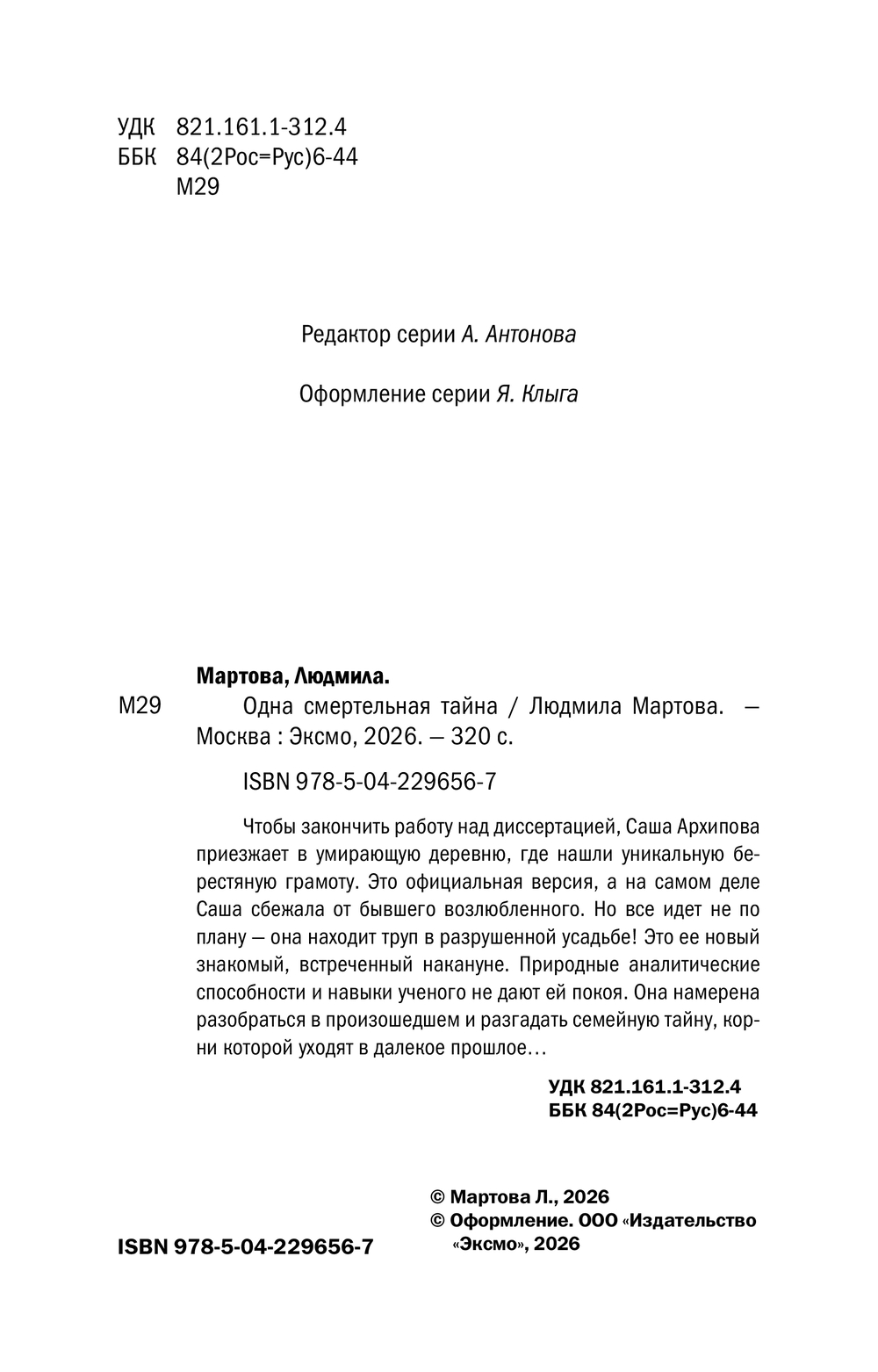 Чтобы закончить работу над диссертацией, Саша Архипова приезжает в умирающую деревню, где нашли уникальную берестяную грамоту. Это официальная версия, а на самом деле Саша сбежала от бывшего возлюбленного. Но все идет не по плану – она находит труп в разрушенной усадьбе! Это ее новый знакомый, встреченный накануне. Природные аналитические способности и навыки ученого не дают ей покоя. Она намерена разобраться в произошедшем и разгадать семейную тайну, корни которой уходят в далекое прошлое…