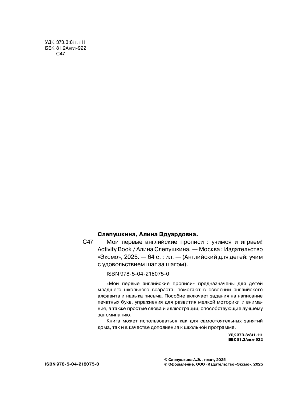 "Мои первые английские прописи" предназначены для детей младшего школьного возраста, помогают в освоении английского алфавита и навыка письма. Пособие включает задания на написание печатных букв, упражнения для развития мелкой моторики и внимания, а также простые слова и иллюстрации, способствующие лучшему запоминанию.