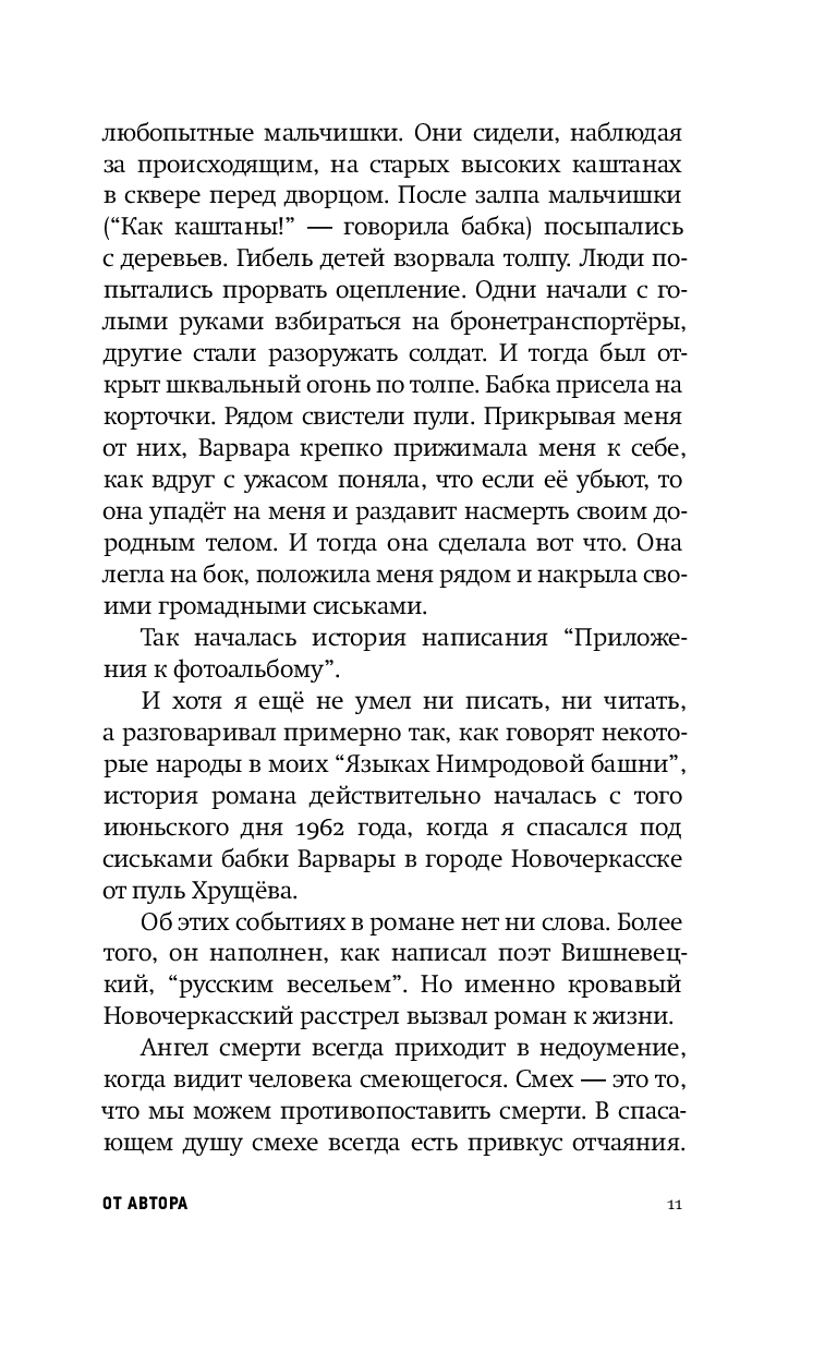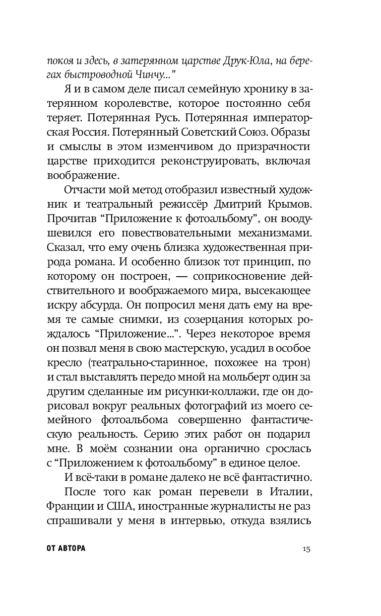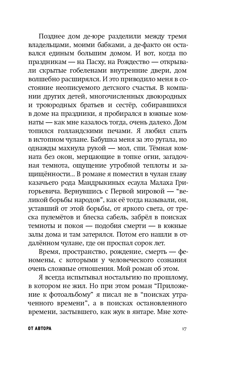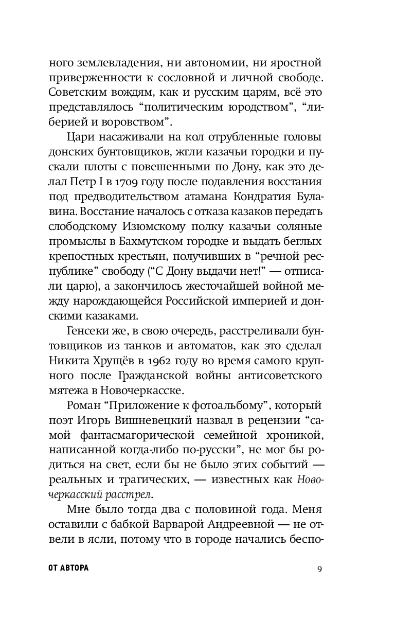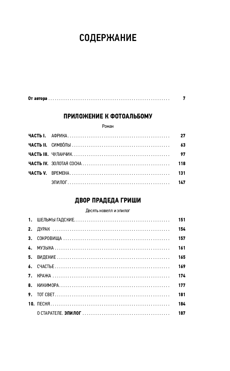 В книгу вошли роман "Приложение к фотоальбому” – фантасмагорическая семейная хроника с иллюстрациями Дмитрия Крымова и повести в рассказах "Двор прадеда Гриши” и "Новочеркасск".