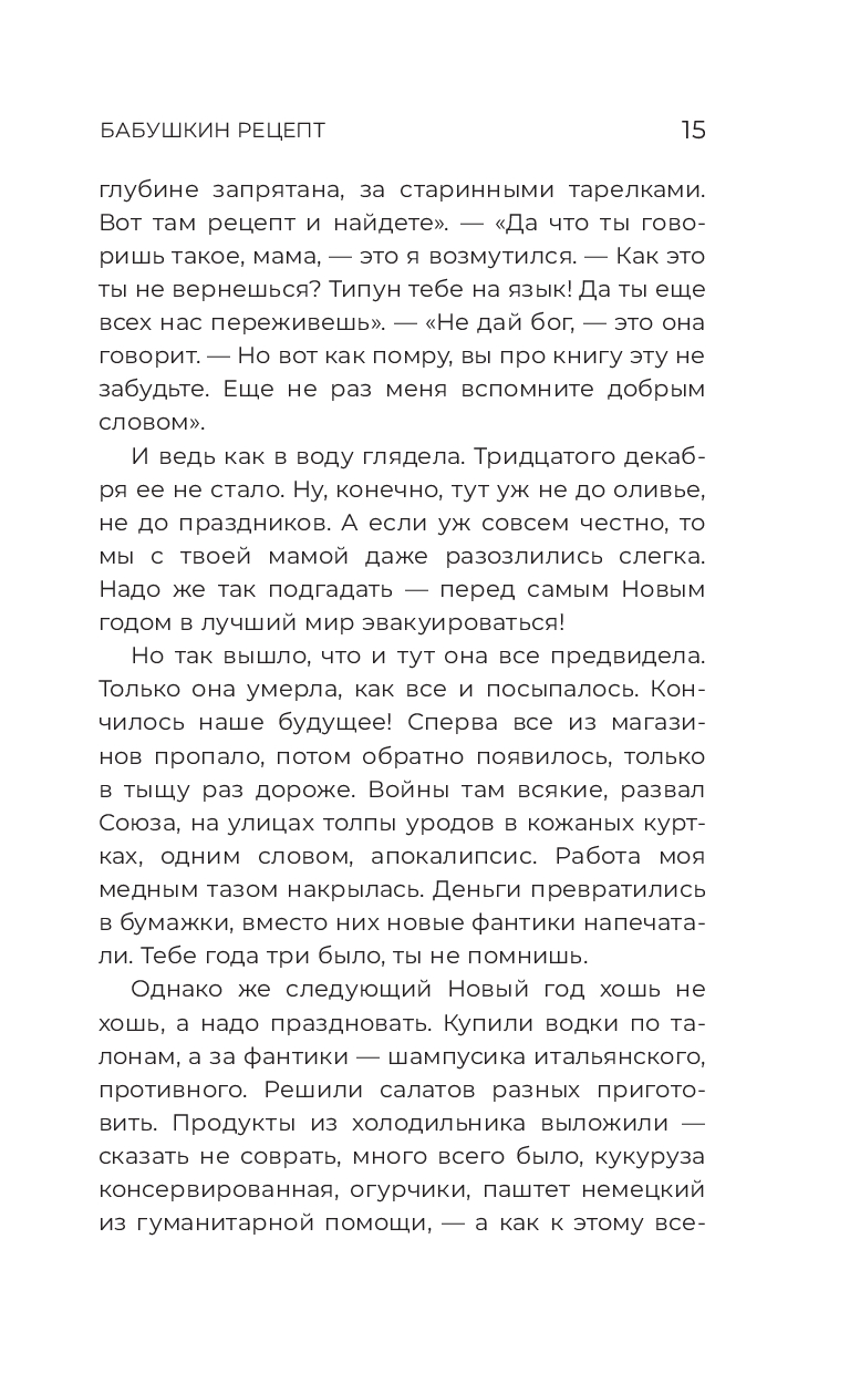 Как при приготовлении уникального блюда, здесь собраны разнообразные "ингредиенты": юмор, ностальгия, тепло семейных моментов, неожиданные и трогательные истории. Чтение этих рассказов – настоящий праздник для души, похожий на вкусный салат, приготовленный с любовью и мастерством.