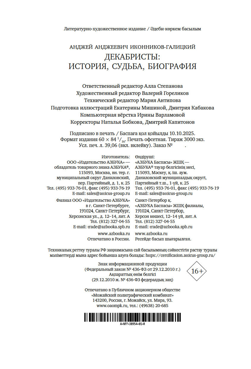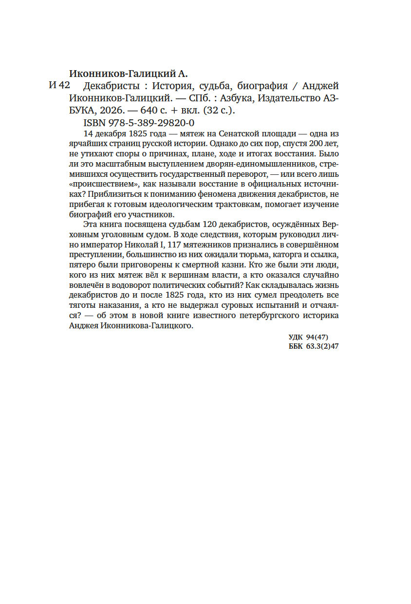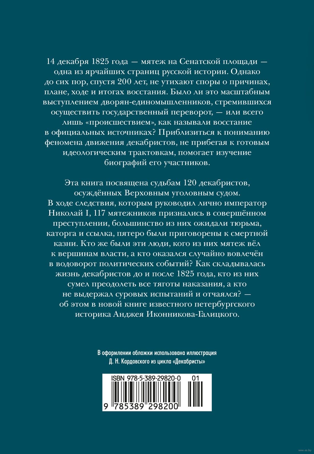 Эта книга посвящена судьбам 120 декабристов, осуждённых Верховным уголовным судом. В ходе следствия, которым руководил лично император Николай I, 117 мятежников признались в совершённом преступлении, большинство из них ожидали тюрьма, каторга и ссылка, пятеро были приговорены к смертной казни. Кто же были эти люди, кого из них мятеж вёл к вершинам власти, а кто оказался случайно вовлечён в водоворот политических событий? Как складывалась жизнь декабристов до и после 1825 года, кто из них сумел преодолеть все тяготы наказания, а кто не выдержал суровых испытаний и отчаялся? – об этом в новой книге известного петербургского историка Анджея Иконникова-Галицкого.