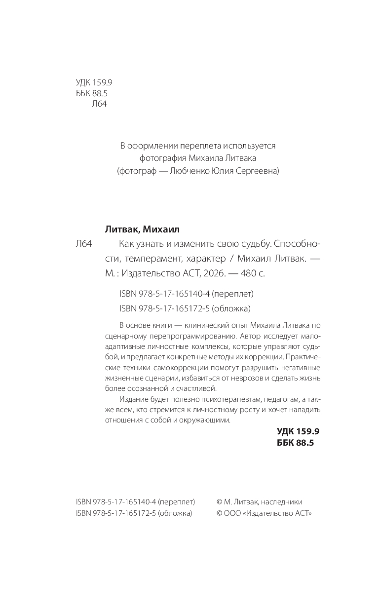 В основе книги – клинический опыт Михаила Литвака по сценарному перепрограммированию. Автор исследует малоадаптивные личностные комплексы, которые управляют судьбой, и предлагает конкретные методы их коррекции. Практические техники самокоррекции помогут разрушить негативные жизненные сценарии, избавиться от неврозов и сделать жизнь более осознанной и счастливой.