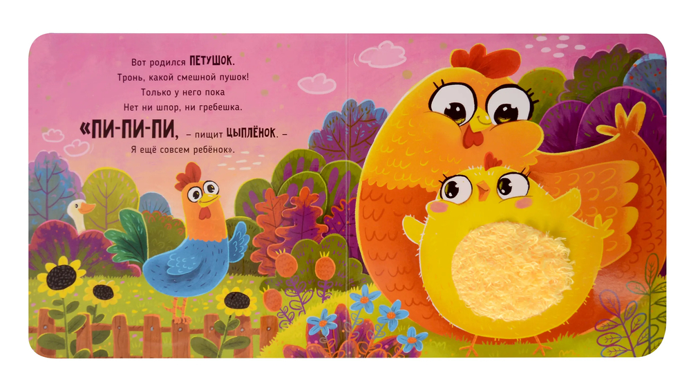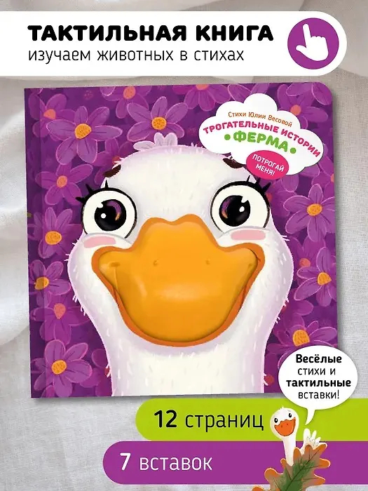 Трогательные истории в забавных стихах болтушках об обитателях фермы для самых маленьких от Юлии Весовой. Серия инновационных тактильных книг для детей и малышей от 0-1 лет, которые не только расскажут об интересных животных, но и позволят прикоснуться к персонажам. Какая грива у лошади? Какой язык у коровы? Какое оперение у цыпленка? Какие бока у козы? Потрогай и узнаешь! Она развивает воображение, память, моторику ребёнка по методике Монтессори, но и способствует запуску речи.