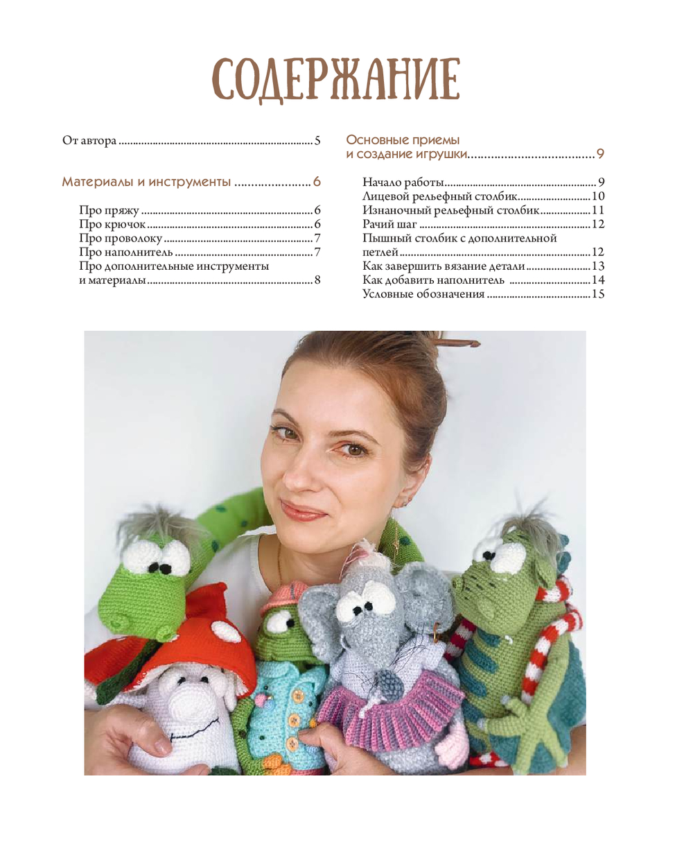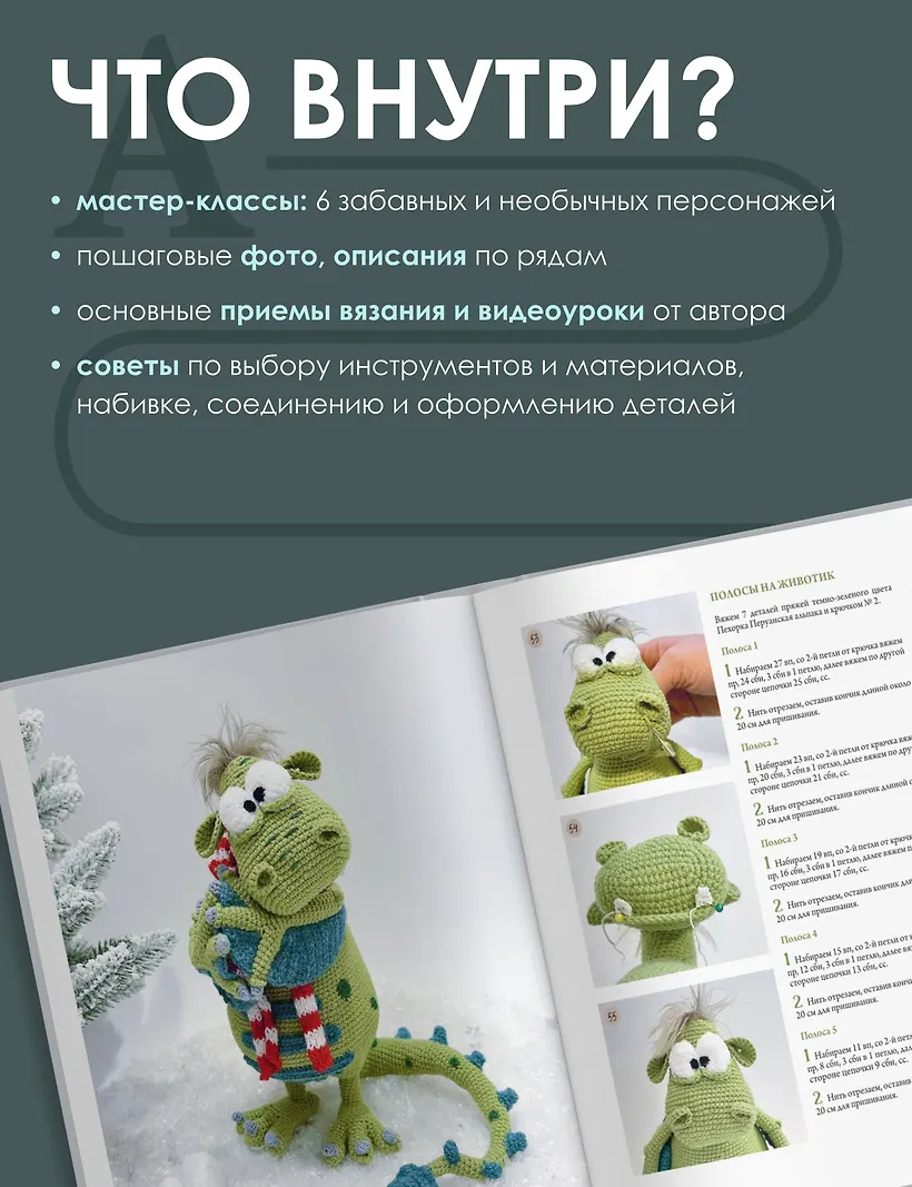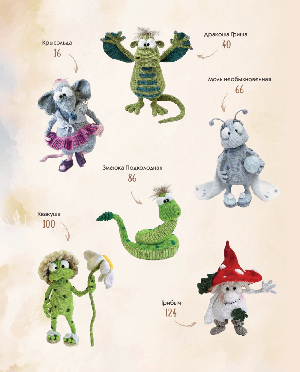 В книге представлено 6 мастер-классов, по которым можно связать крючком забавных и необычных персонажей: дедушку Грибыча, добрую Змеюку, очаровательную Крысэльду, милого Дракошу, лягушек Квакушу и мистера Хлюпа, а также необыкновенную Моль. Все мастер-классы сопровождают пошаговые фото, описания по рядам, советы по выбору инструментов и материалов, набивке, соединению и оформлению деталей. Также в книге собраны основные приемы вязания и видеоуроки от автора, доступные по QR-кодам.