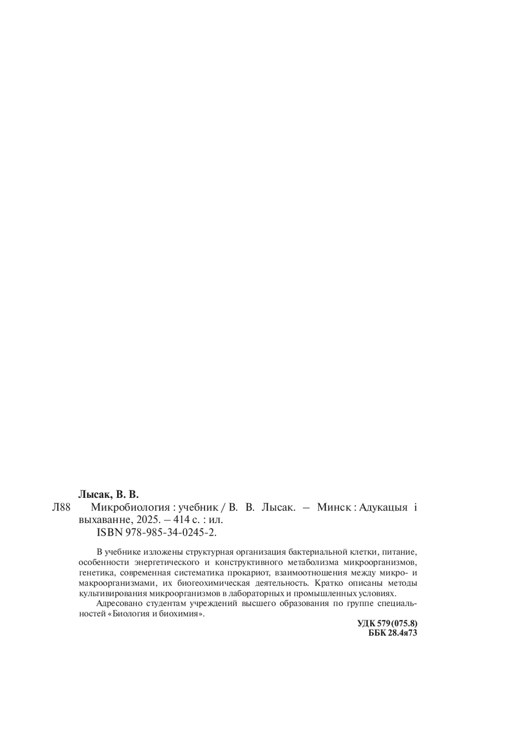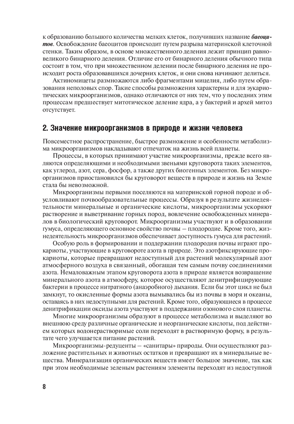 В учебнике изложены структурная организация бактериальной клетки, питание, особенности энергетического и конструктивного метаболизма микроорганизмов, генетика, современная систематика прокариот, взаимоотношения между микро- и макроорганизмами, их биогеохимическая деятельность. Кратко описаны методы культивирования микроорганизмов в лабораторных и промышленных условиях.