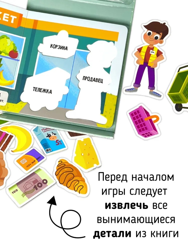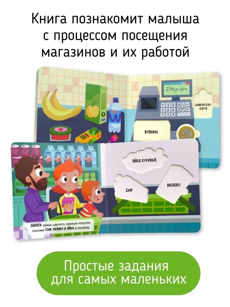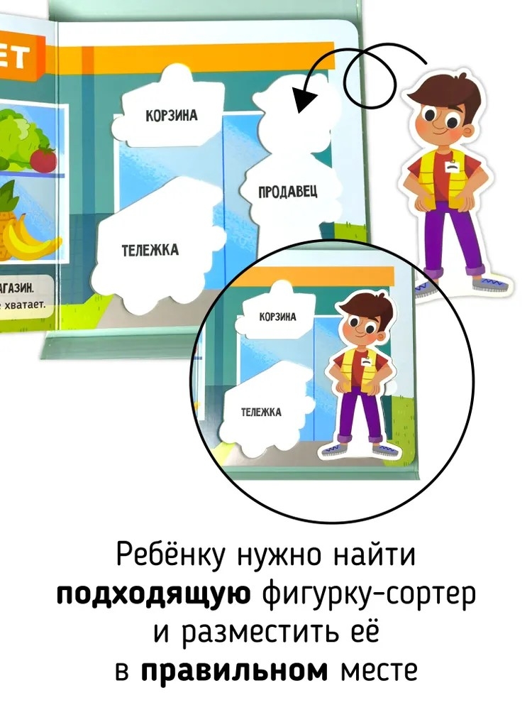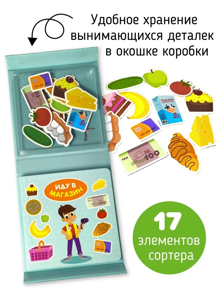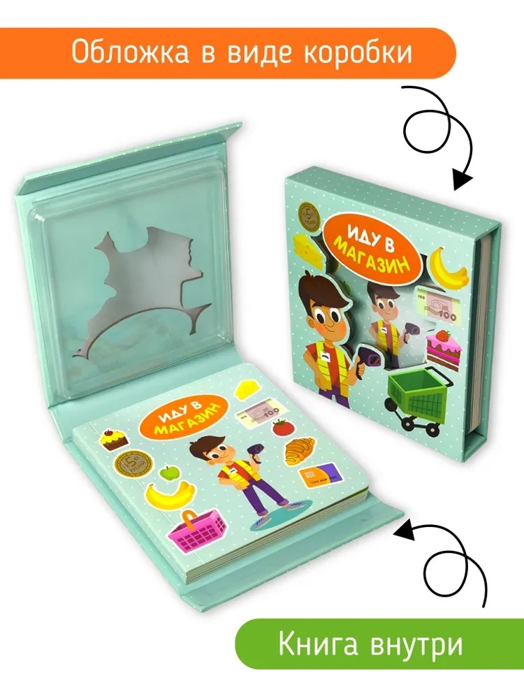 Погрузите вашего малыша в волшебный мир покупок с нашей развивающей книгой-сортер "Иду в магазин"! Это не просто книга, а интерактивное приключение, которое делает обучение веселым и увлекательным. Данная развивашка помогает маленьким исследователям познакомится с процессом посещения магазинов: освоить навыки складывать необходимые продукты в корзину, раскладывать товары на витрине и даже оплачивать их на кассе.