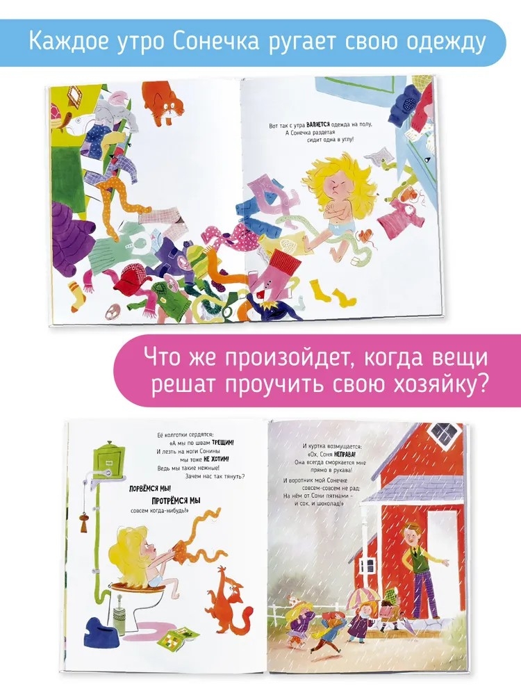 Каждое утро Сонечка ругает свою одежду. Она совсем не любит ее надевать! Однажды платьица, юбочки, брючки и все-все-все остальные вещи очень обиделись на хозяйку. Ведь девчушка очень плохо обращается с ними! Что будет, если они решат проучить Сонечку? Эта захватывающая история в стихах предназначена для детей от 3 лет и идеально подходит для совместного чтения перед сном.