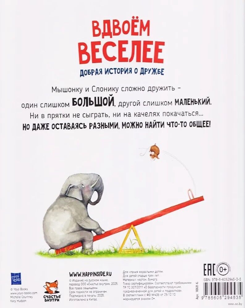 Мышонку и слонику сложно дружить – один очень большой, другой слишком маленький. Ни в прятки не сыграть, ни на качелях покачаться… Но даже оставаясь разными, можно найти что-то общее! Эта увлекательная история в прозе для детей от 3 лет, для дошкольников и младших школьников, идеально подходит для совместного чтения перед сном.