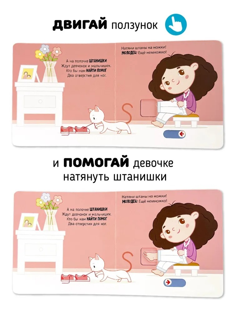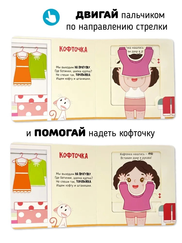 На прогулку собираясь, без подсказок я стараюсь все надеть как на картинке: кофту, штаники, ботинки. Книжка-малышка включает 5 крупных интерактивных элементов и простые задания, которые делают процесс чтения увлекательным.