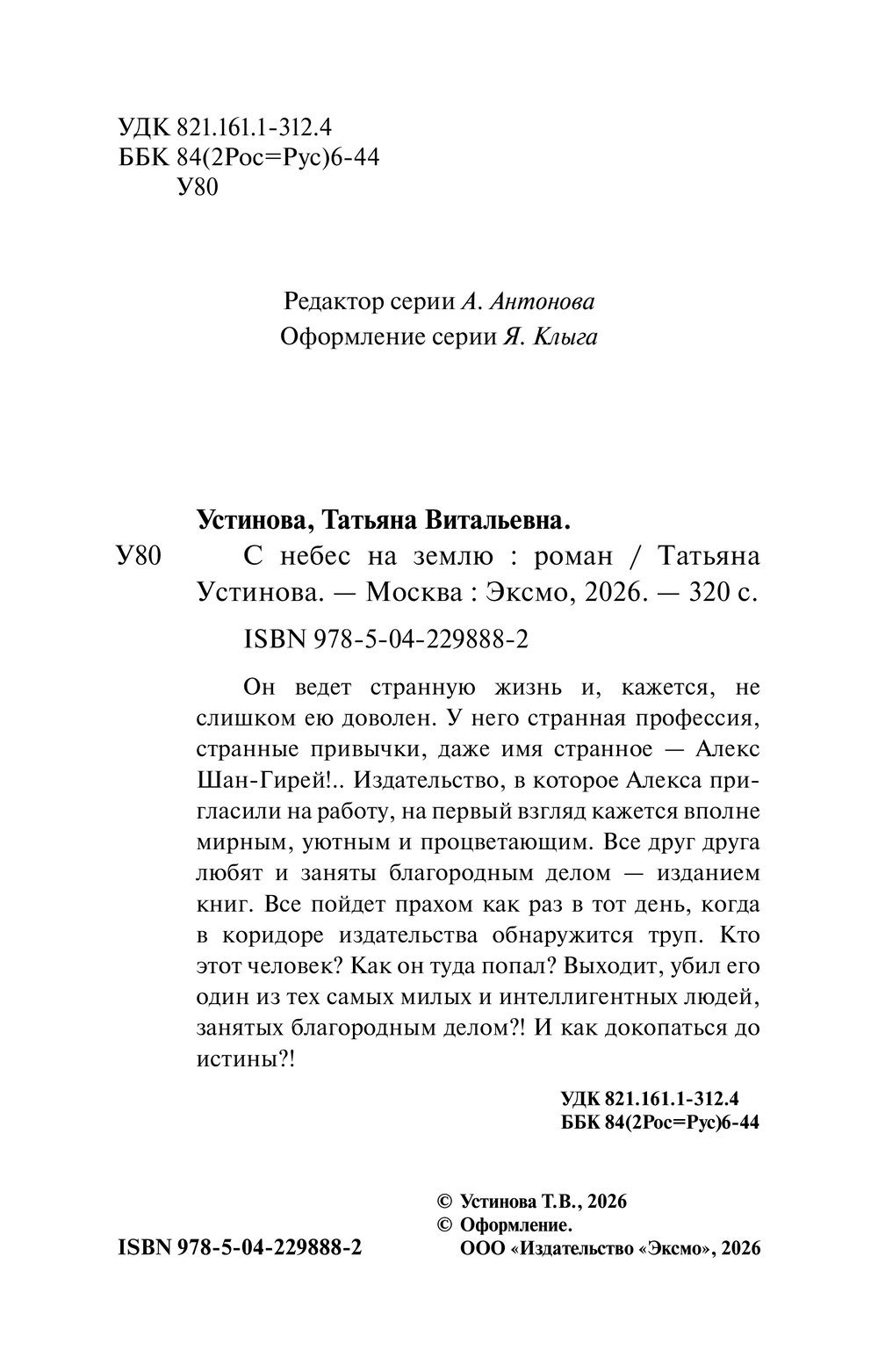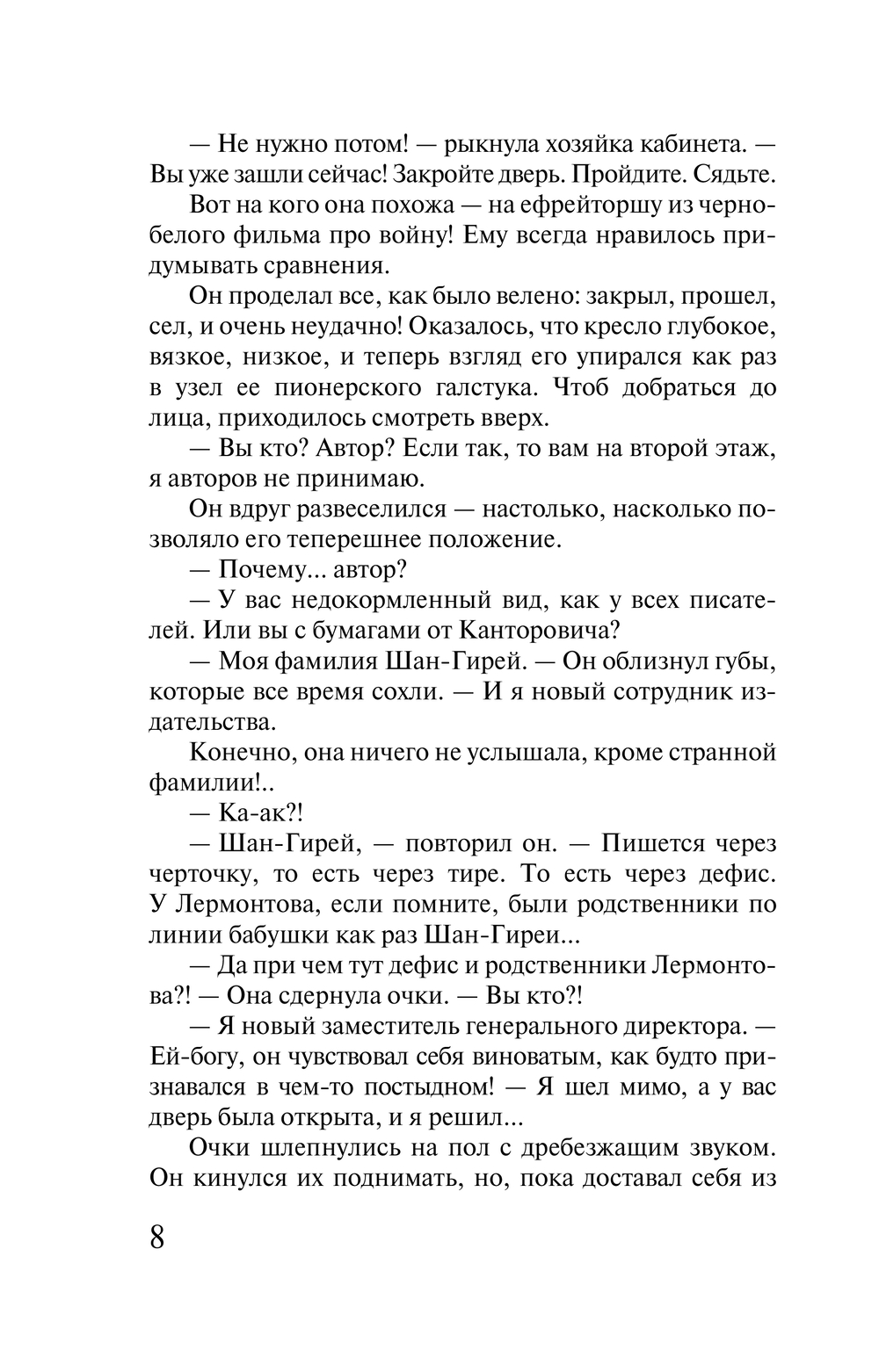 Он ведет странную жизнь и, кажется, не слишком ею доволен. У него странная профессия, странные привычки, даже имя странное – Алекс Шан-Гирей!.. Издательство, в которое Алекса пригласили на работу, на первый взгляд кажется вполне мирным, уютным и процветающим. Все друг друга любят и заняты благородным делом – изданием книг. Все пойдет прахом как раз в тот день, когда в коридоре издательства обнаружится труп. Кто этот человек? Как он туда попал? Выходит, убил его один из тех самых милых и интеллигентных людей, занятых благородным делом?! И как докопаться до истины?!