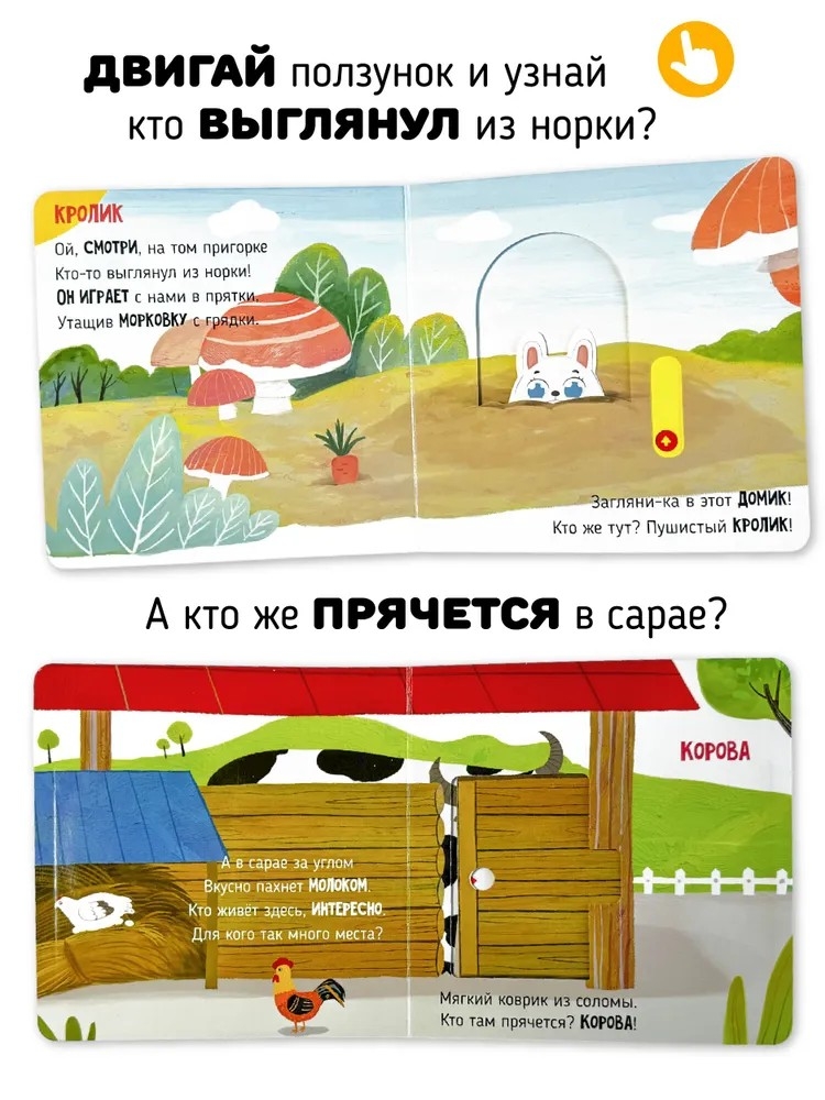 Заходи на нашу ферму: ты узнаешь непременно, что на грядках здесь растет, кто мычит, а кто поет. А если ты внимательный, найдешь всех обитателей! Книжка-малышка включает 5 крупных интерактивных элементов (морковка, петушок, корова, кролик) и простые задания, которые делают процесс чтения увлекательным.