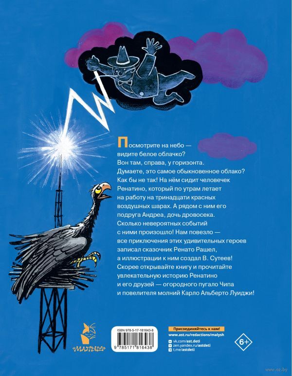 Владимир Сутеев – замечательный сказочник и иллюстратор, его работы – классика детской литературы. В нашей книге "Ренатино не летает по воскресеньям" иллюстрации этого знаменитого художника. Главный герой, Ренатино, носит зелёную шляпу и длинный жёлтый шарф, а на работу – работает он нянечкой у семи воробьёв, – летает на красных воздушных шарах. Жизнь Ренатино наполнена удивительными приключениями и необычными друзьями. В сказке всегда побеждает добро: даже те, кто в начале сказки совершал злые поступки, после общения с Ренатино начинают ему помогать.