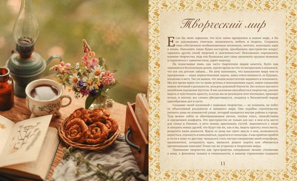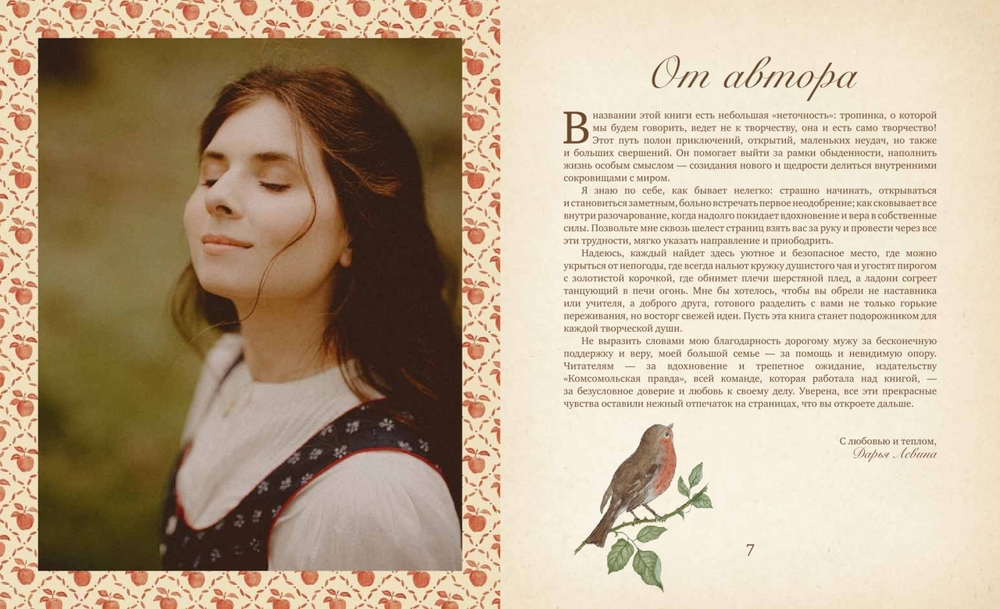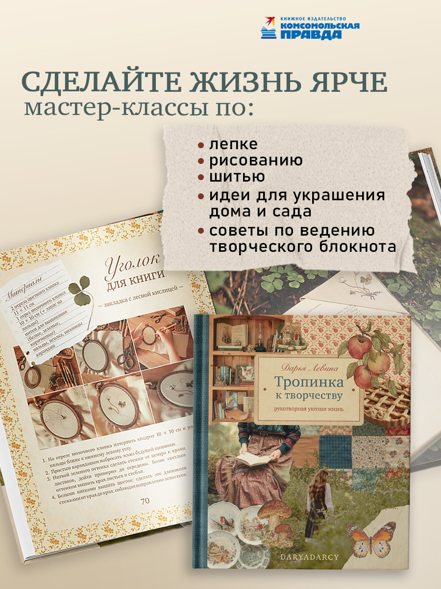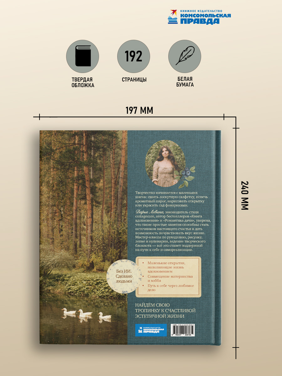 В новой книге Дарьи Левиной, законодательницы стиля cottagecore, автора бестселлеров "Книга вдохновения" и "Романтика дачи" собрано всё, что делает жизнь ярче: мастер-классы по лепке, рисованию, шитью и вышивке, идеи для украшения дома и сада и даже советы по ведению творческого блокнота. На примере собственного опыта Дарья показывает, что творчество может быть не только увлечением, но и внутренней опорой. Вы найдете размышления о том, как искать вдохновение и развить талант, как справляться с критикой и творческими кризисами, как совмещать хобби с материнством и повседневными заботами. А маленькие творческие ритуалы помогут шаг за шагом обрести уверенность в себе. Отдельное удовольствие – любимые сезонные рецепты: пастушье рагу, крамбл с ревенем, тыквенный пирог, зимнее печенье и ещё много лакомств.
