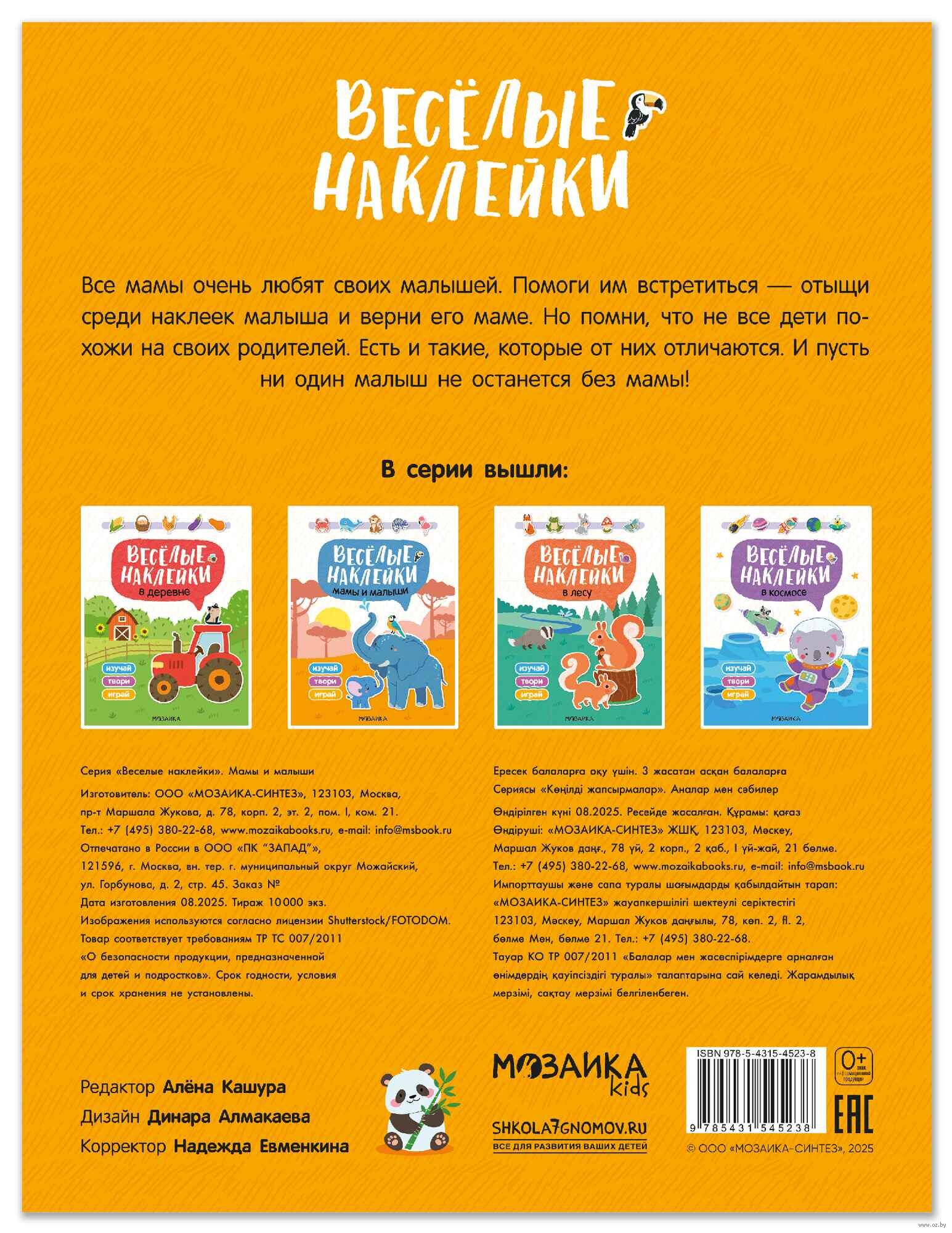 Книга серии "Веселые наклейки" позволит ребенку самостоятельно, без помощи родителей, весело провести время и одновременно позаниматься. Играя с наклейками, ребенок пополнит словарный запас, разовьет фантазию и память, счет и творческое мышление. Наклейки можно размещать, где угодно. Они подойдут и для первого знакомства с наклейками, и для малышей постарше.