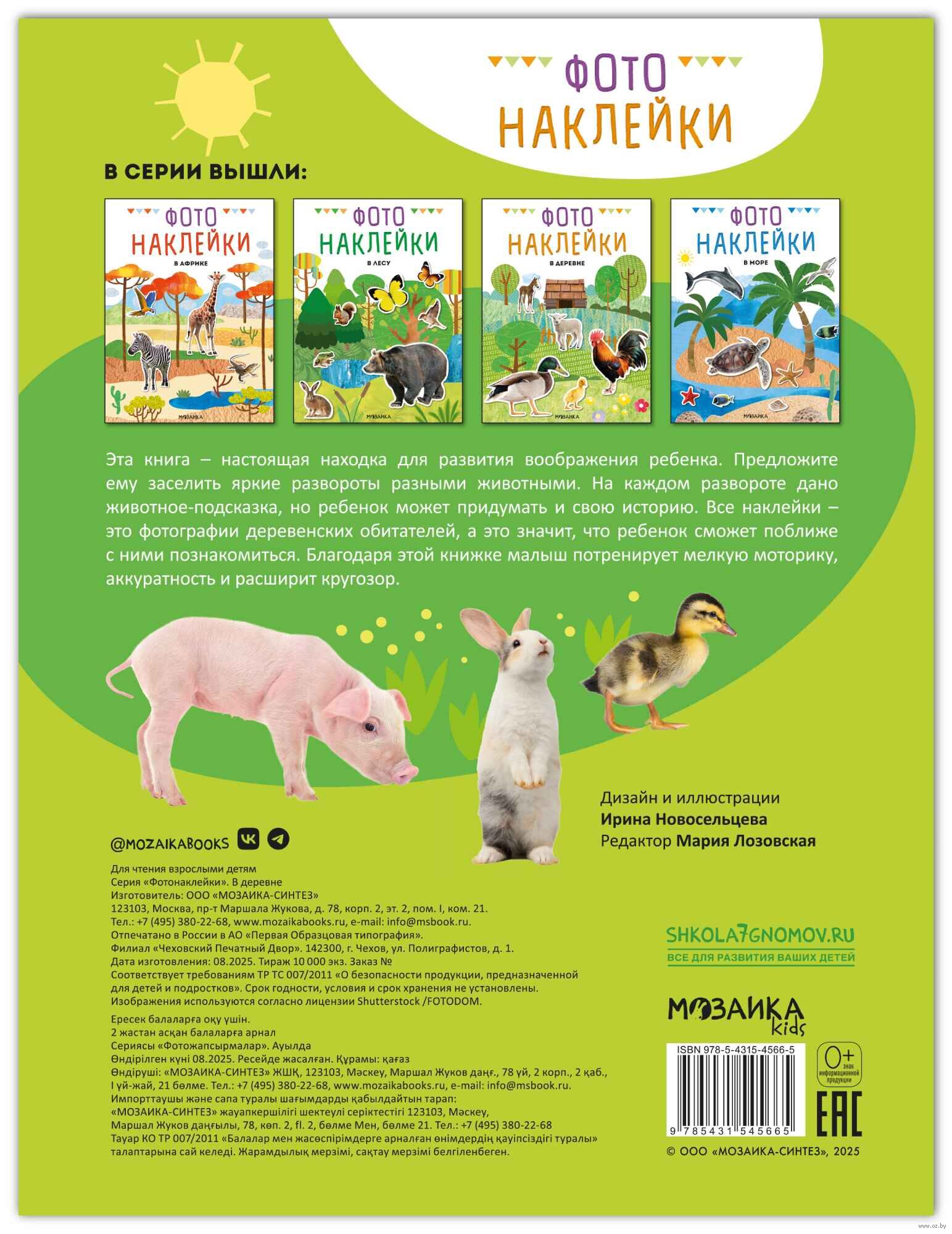 Книга серии "Фотонаклейки" – настоящая находка для развития воображения ребенка. Яркие страницы с коллажными иллюстрациями нужно заполнить разными животными. На каждом развороте дано животное-подсказка, но ребенок может придумать и свою историю. Все наклейки – это фотографии обитателей деревни, а это значит, что ребенок сможет поближе с ними познакомиться. Благодаря этой книжке малыш потренирует мелкую моторику, аккуратность и расширит кругозор.